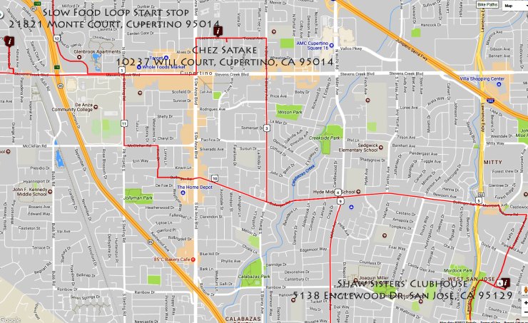 The tour starts at a special “Slow Food South Bay” stop at Joni Sare’s home behind the Cupertino Post Office. You can park your car here (plenty of curbside parking), unload your bike and start your tour here. See details, below, for parking and entering the backyard.
