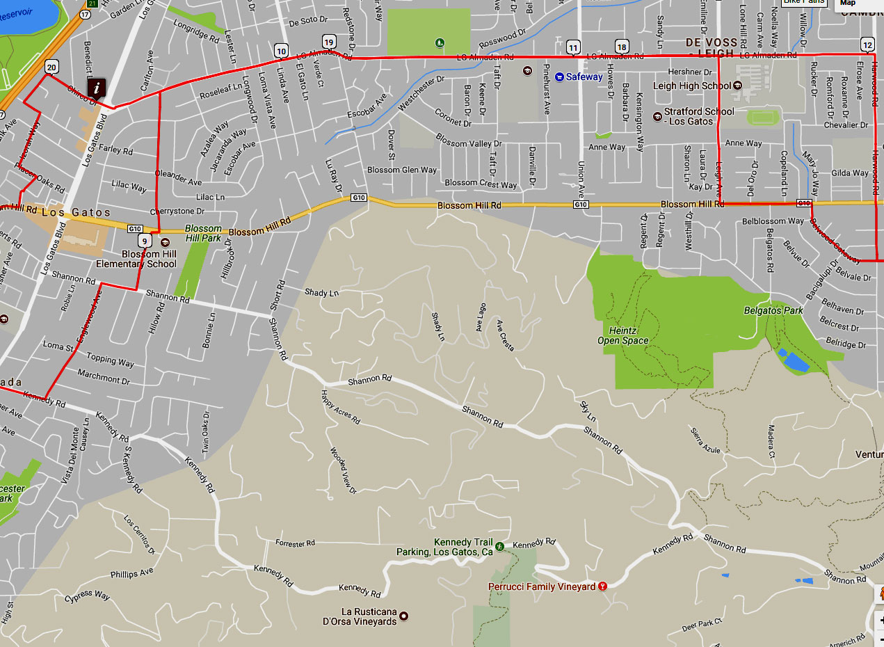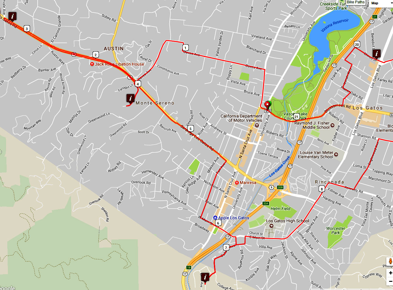 If you want to skip out on one coop, you can ride just ride about 11 miles, 5 coops avoiding the long out and back on Los Gatos Almaden Rd.