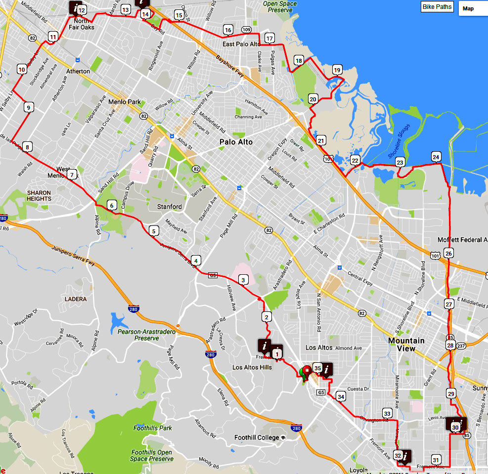 The route is not direct and uses bike trails that wind along the bay and creeks.