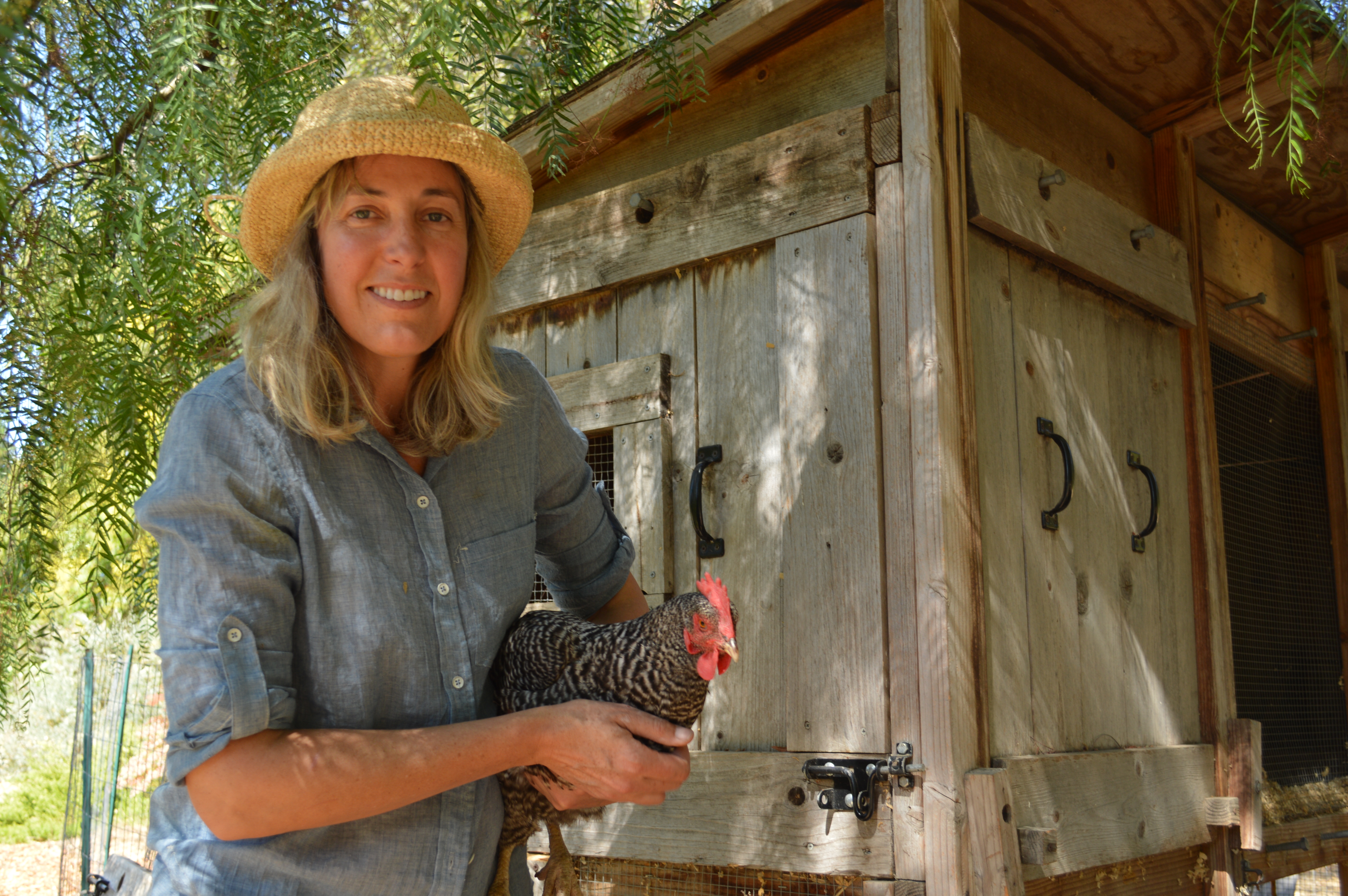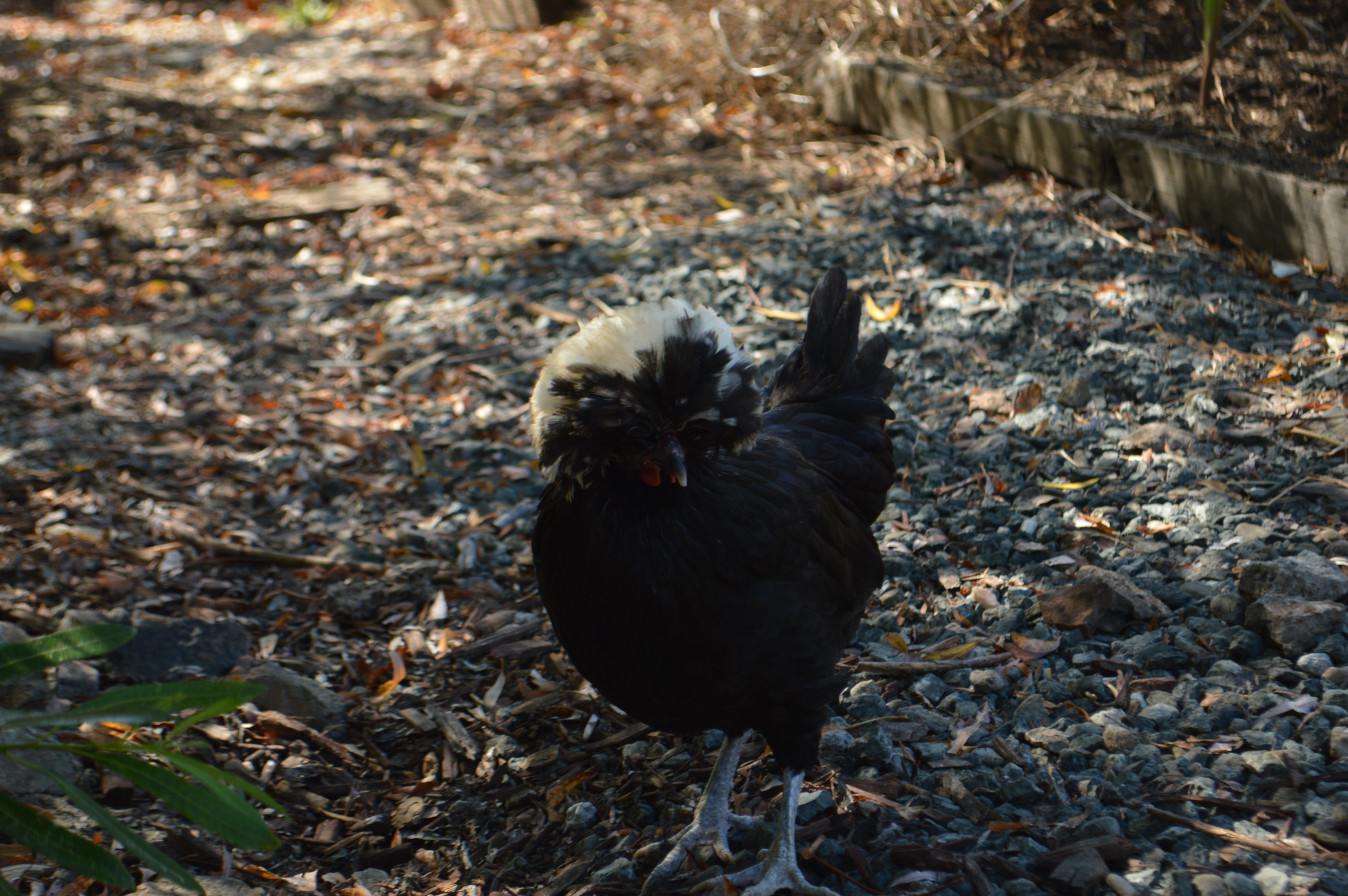 Rustic and low-tech with minimal investment, Campo Cluckers coop is situated in a former apricot orchard beaneath a mature pepper tree. The coop is a very sturdy 4’x8′ two story wood structure that was acquired two years ago from Stanford Community Garden when it was relocated. The four hens who inhabit the coop were received from a neighbor. They’ve been with us since April and they are about 3-1/2 years old. The occupants are “Chuckles” an Ameraucana who lays turquoise eggs; “Red” our Rhode Island Red and “Flecks”, the Plymouth Rock both lay light brownish-tan eggs and “Cher” aka “Snowball” is the Polish Crested hen who lays white eggs, when she lays them.