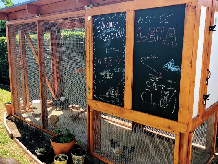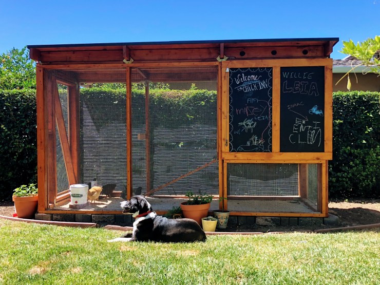One of our chickens, Willow, turned out to be Willie. We found a new home for him. The remaining four hens don’t seem to miss him. They do love to run around our back yard with our dog, who protects them like family.
