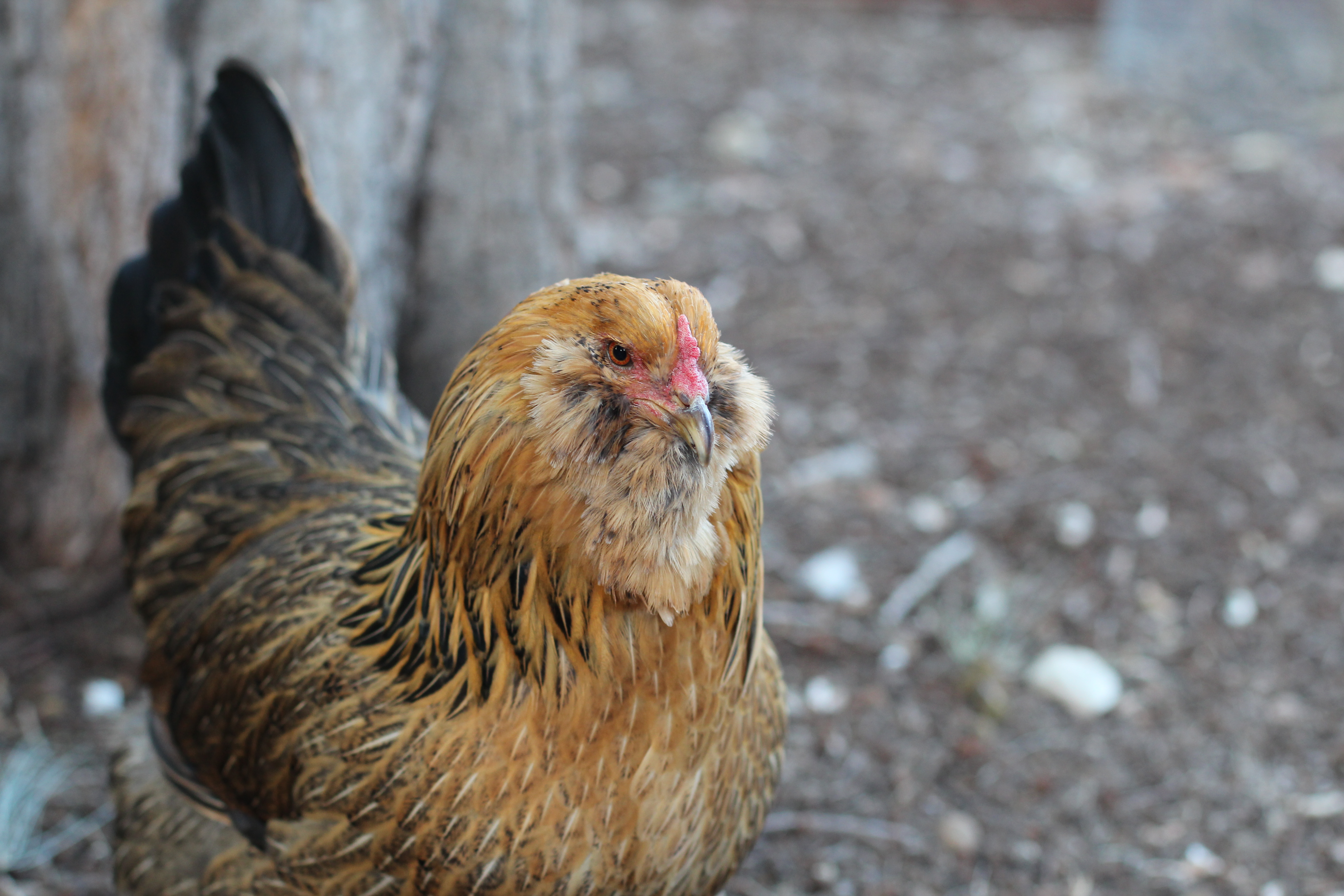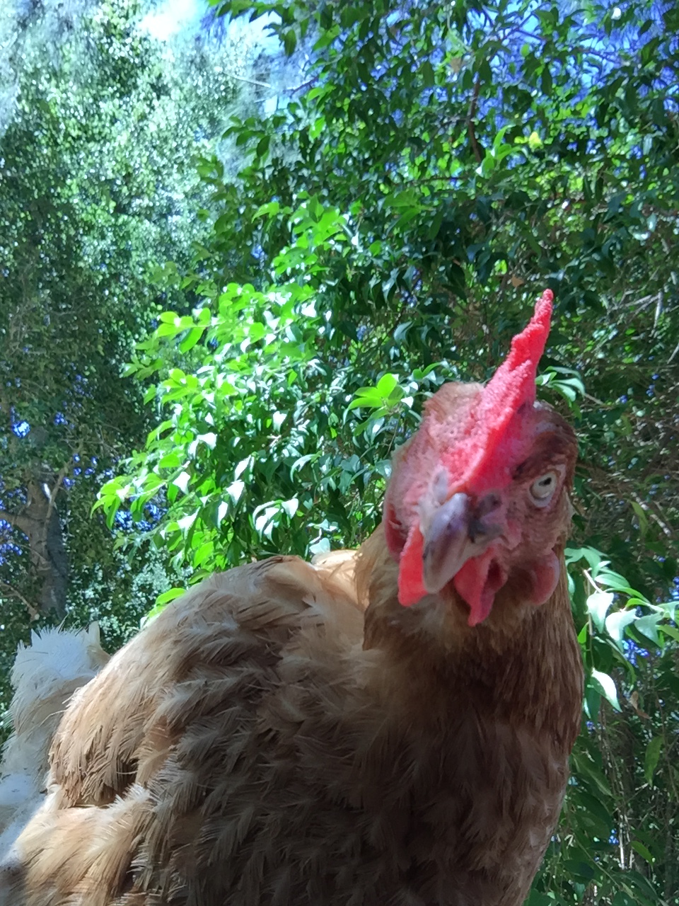 She is a Red Sex Link, rescued from a pasture based egg farm. She is missing an eye and cannot see much from the other one, but she developed the ability to navigate quite well just by listening to every sound around her.