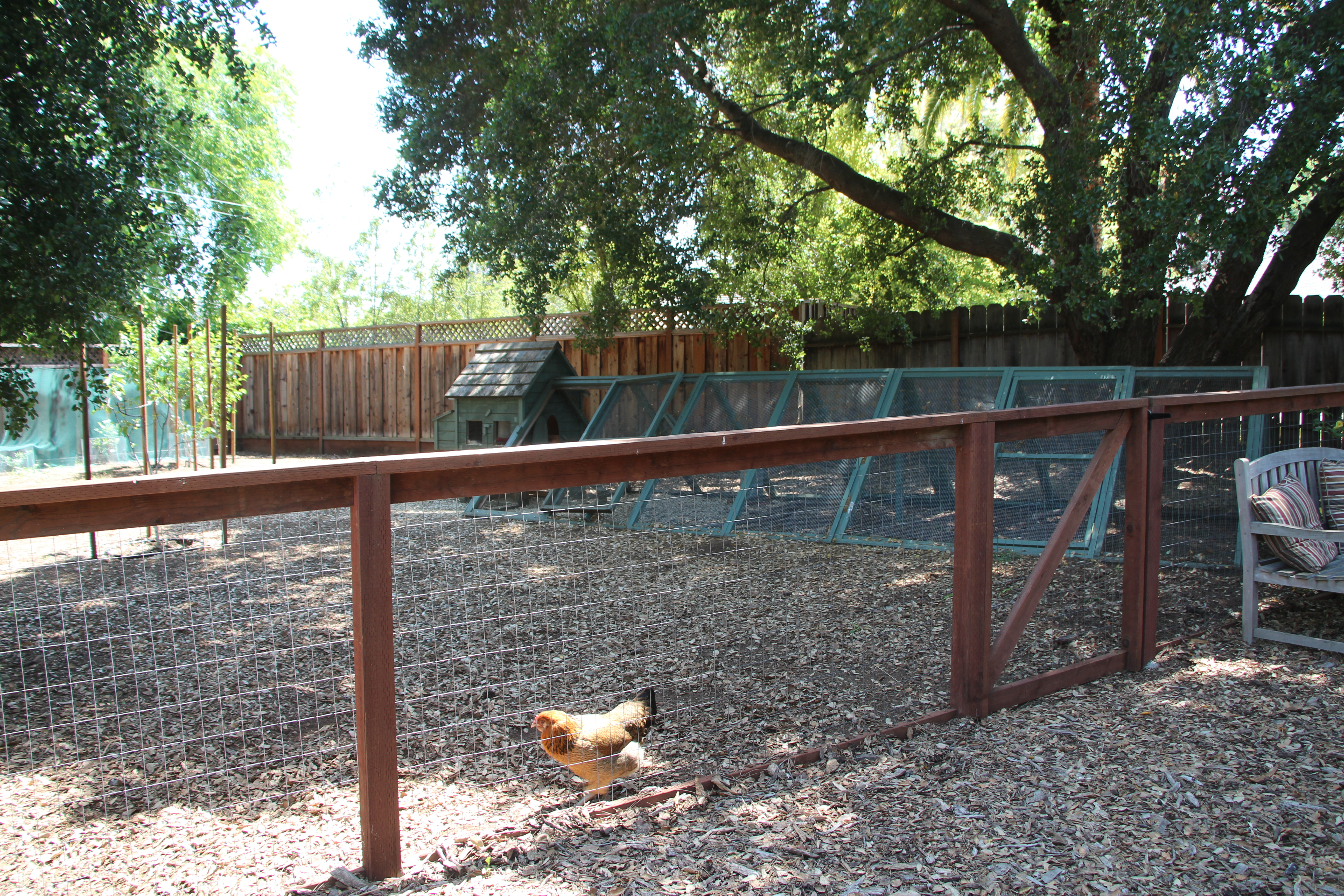 This area is fenced with a 7′ wood fence towards the neighbors, and with a 4′ sheep wire fence to the rest of our backyard. This protects the hens from our dog, and the vegetable garden from the hens!