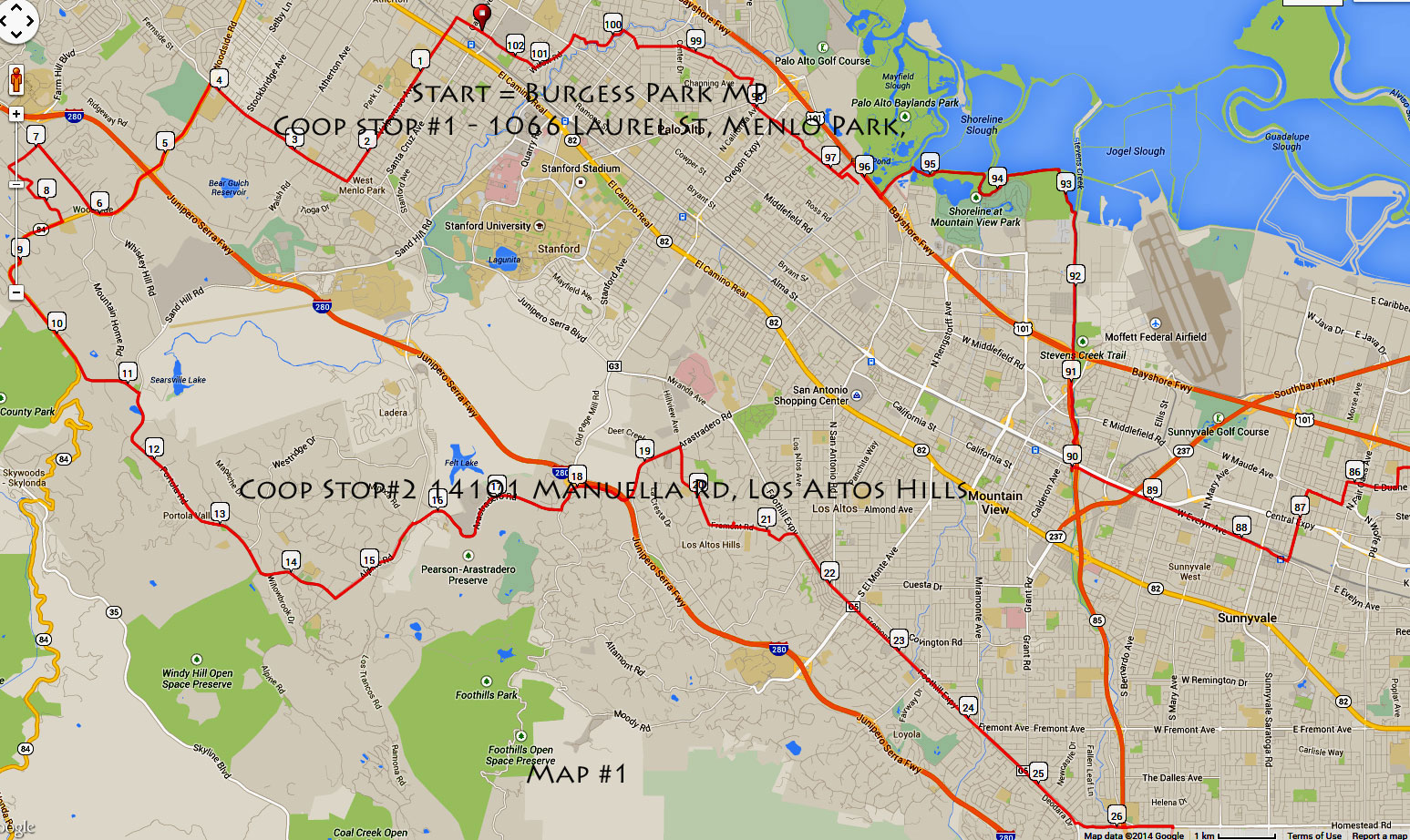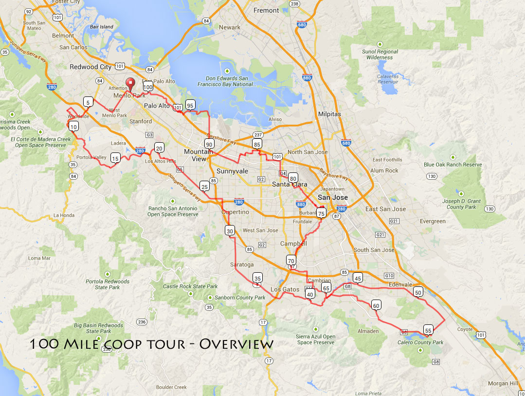 It starts in Menlo Park and heads into Woodside, to Los Altos area, to South San Jose and then back through Sunnyvale, Mtn View, Palo Alto and back to MP.