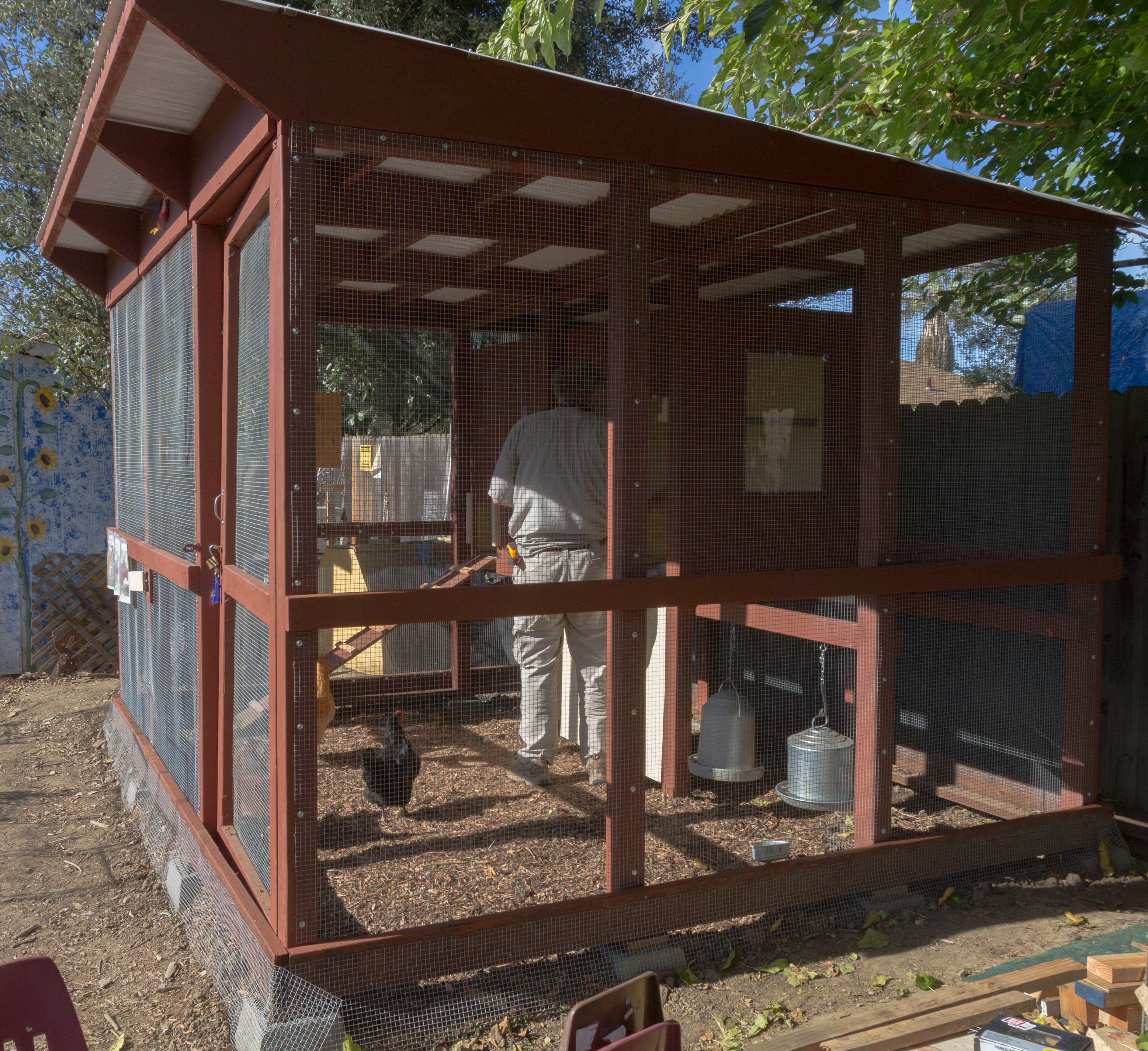 Small four-chicken coop I built this April to replace the nice one we left behind when we moved to California three years ago. I had just finished a Coop Mahal at our old house back east when I got a job offer here. We were finally able to buy a house here and building a coop is one of the first things we did.