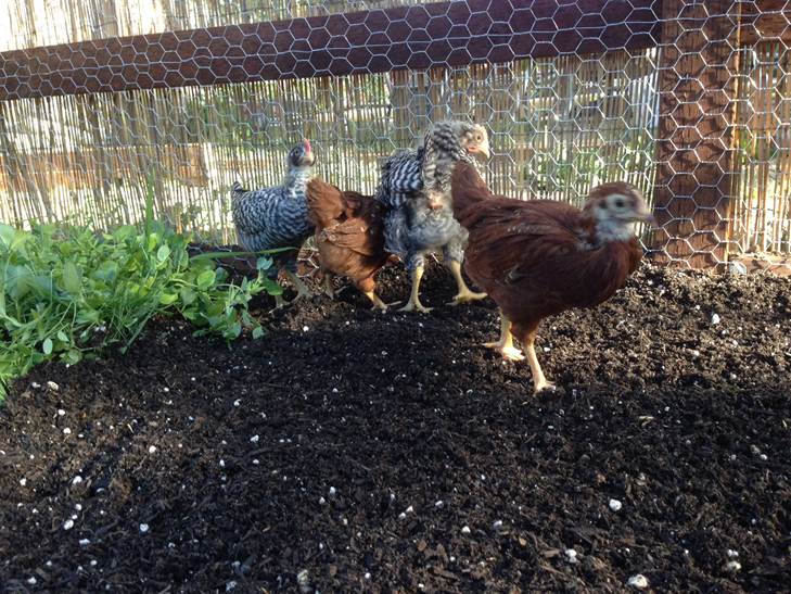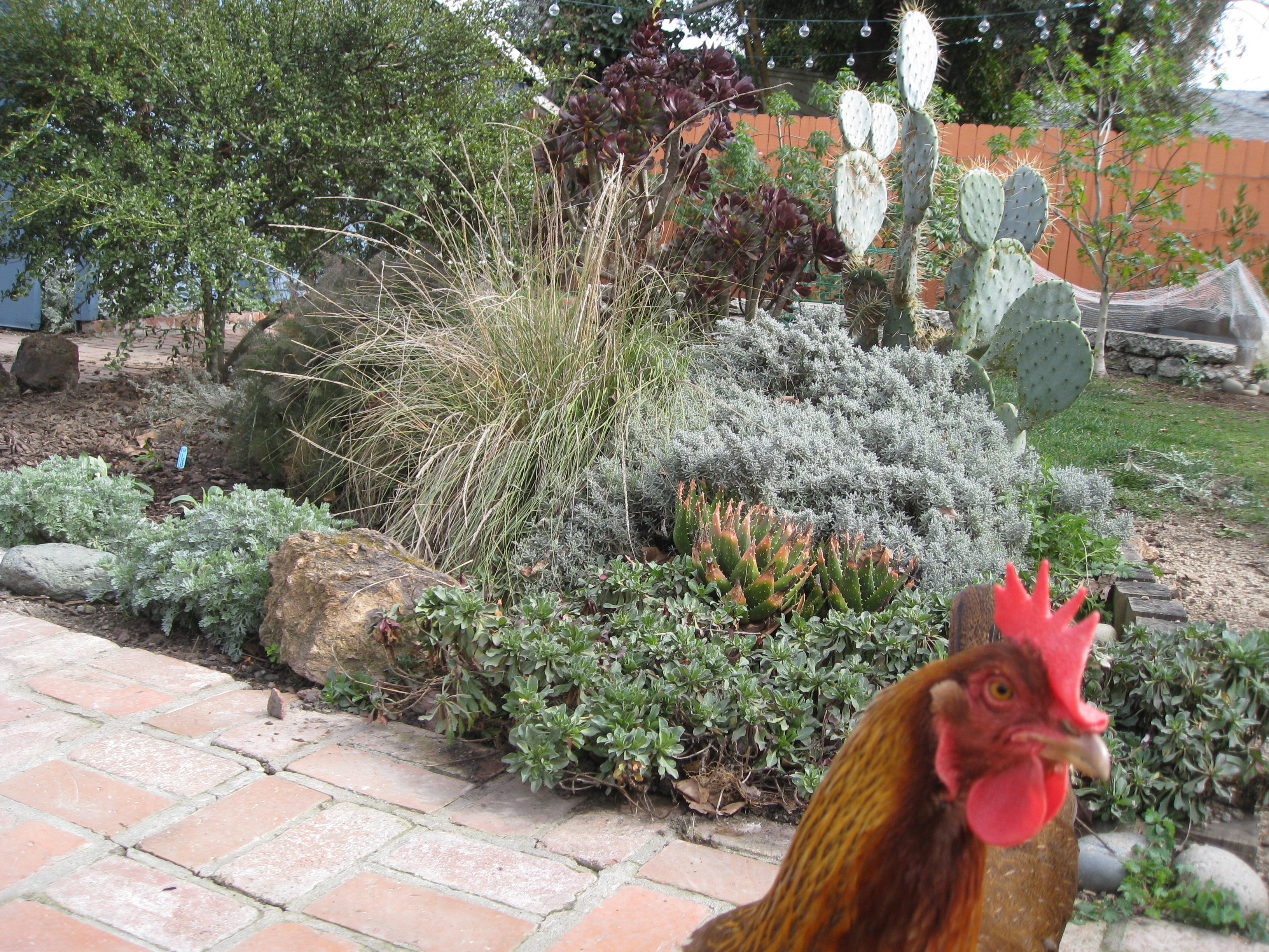- 2-4-6 Farm – Our edible backyard garden is interplanted with California natives and other water-wise plants. Fertilization and pest control is covered by our 2-legged, bug-foraging hens. Our 4-legged dogs keep the squirrels at bay, and pollination services are provided by our hard working, 6-legged bees. The 2-4-6 Farm flock is a mix of one Silver-laced Wyandotte, two Rhode Island Reds, and two Buckeyes. We acquired our heirloom Buckeyes (now 1 year old) from Sustainable Poultry Network-certified breeder Tom Dinwoodie. In anticipation of planting our garlic, onion, and shallot crop this Fall, you’ll see our girls hard at work in our waning Summer vegetable garden beds. They’ll turn the soil, add fertility (aka poop), eat up the remaining plant material and generally prepare the beds for Fall planting time.