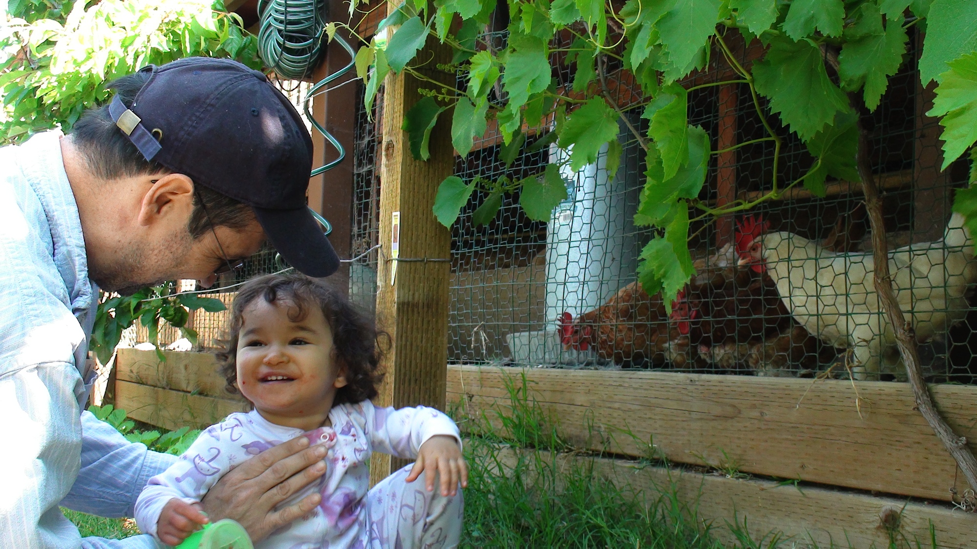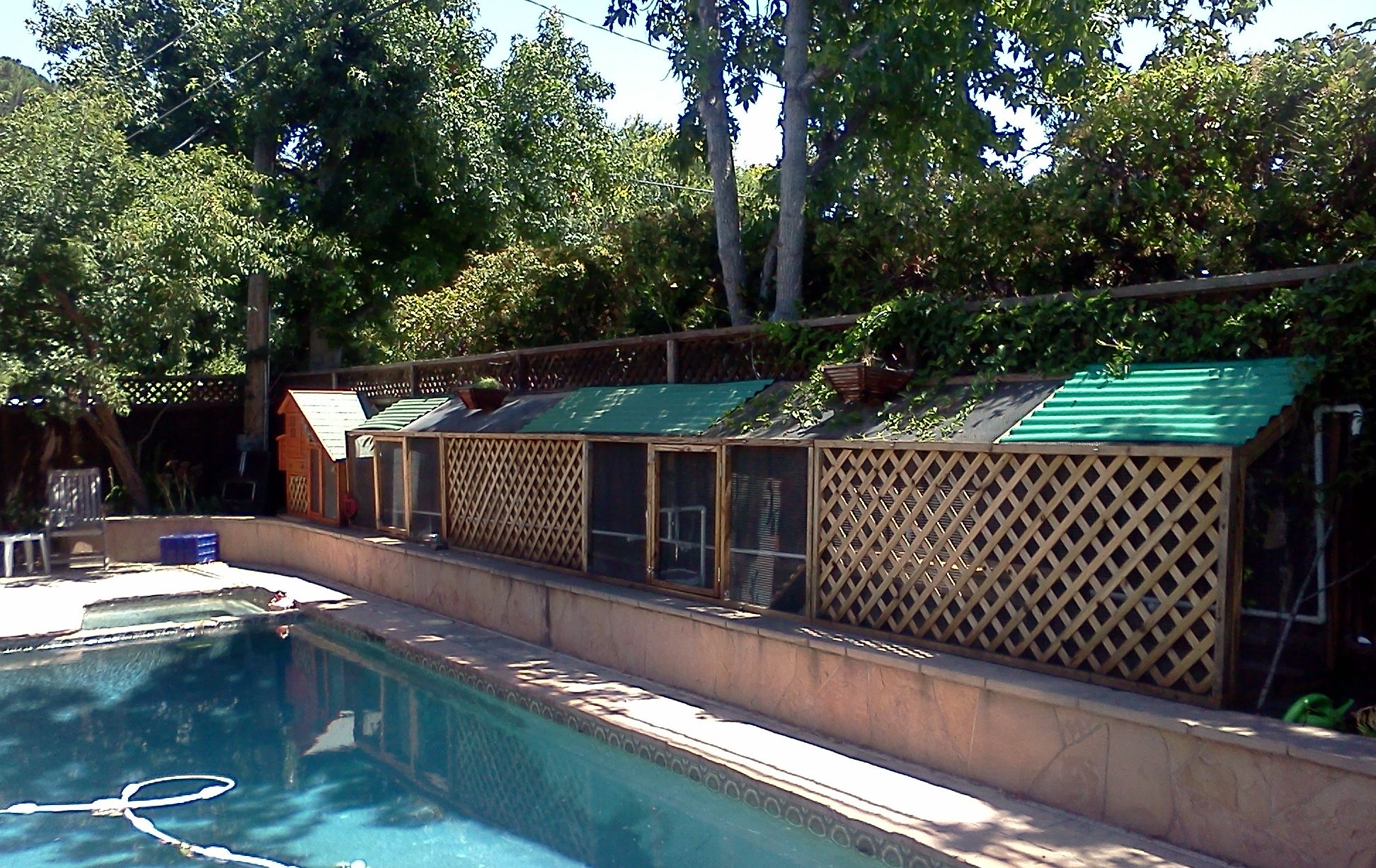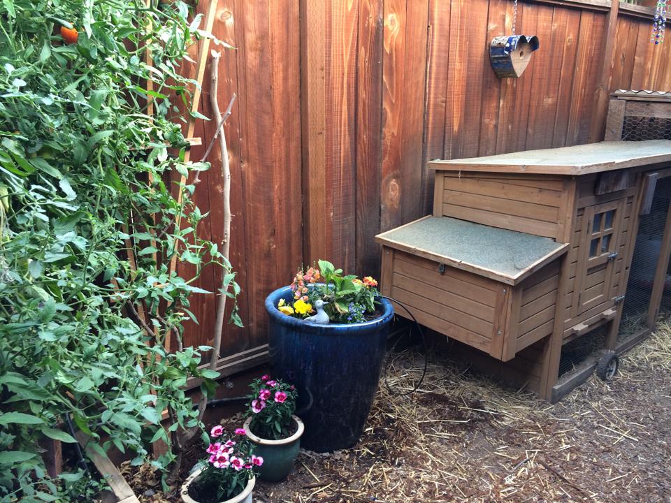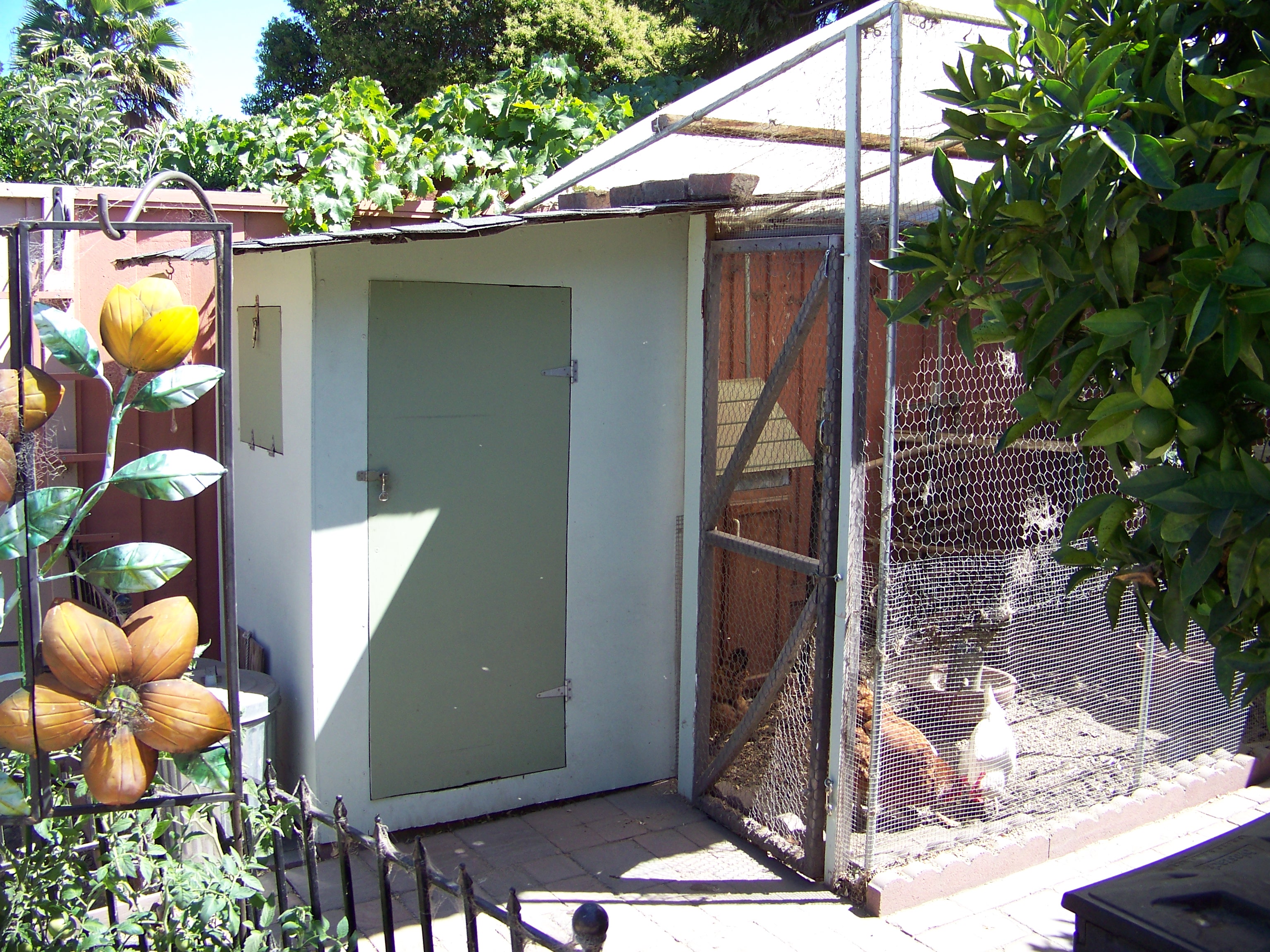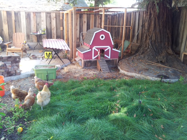 - Redwood Hen Haven – After a few raccoon disasters in past years, we built a sturdy raccoon-proof dwelling for our hens when we moved to a new house. We nestled this enclosure against the side of our house, utilizing a space that would otherwise have gone largely unused. During the day the hens have the full run available to them, and at night they retire to the safety of a fully enclosed run with coop. We’re also happy to show you our 8 young fruit trees and growing backyard garden, as well as an 8-year-old grape vine that we are training along our trellace.