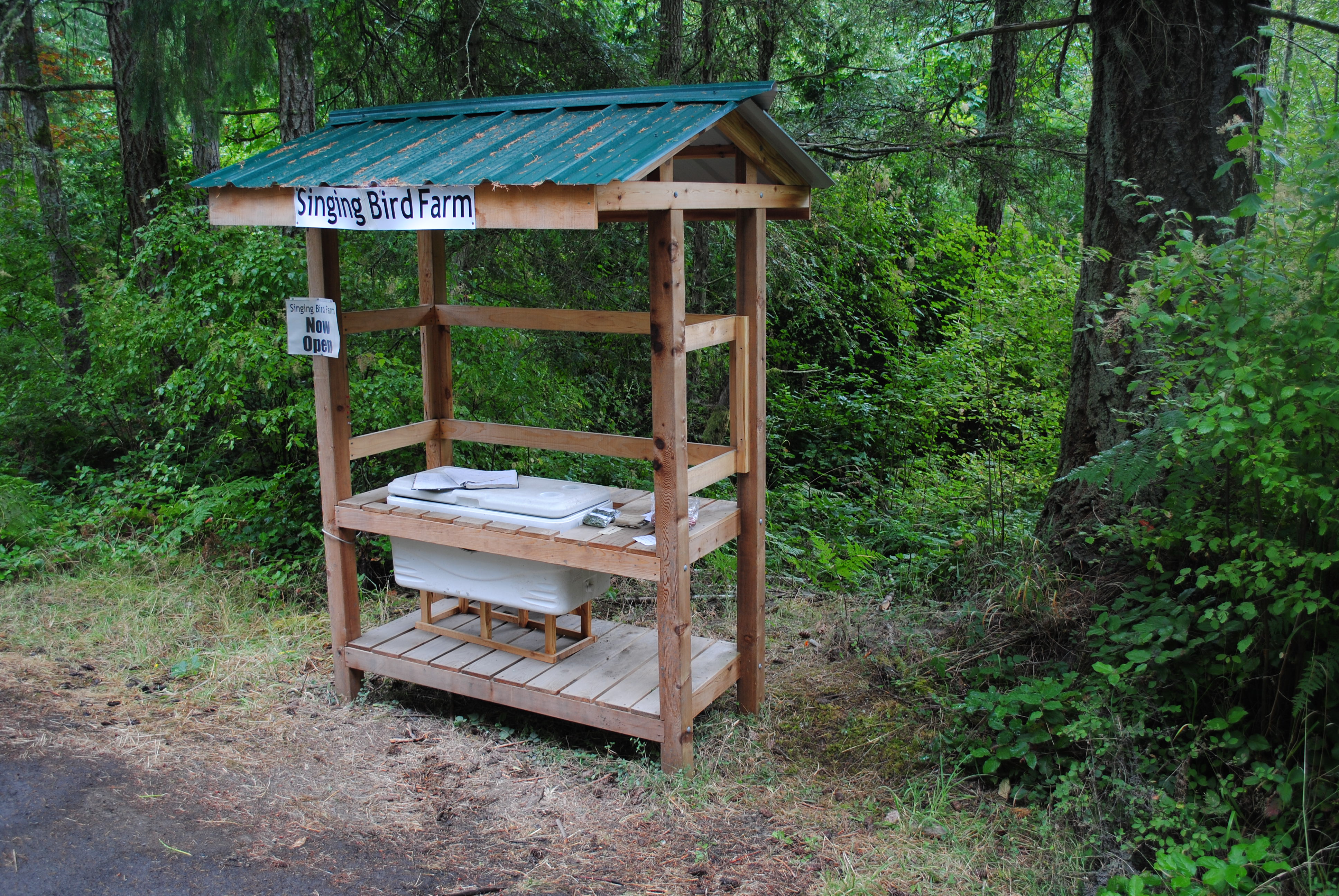 While visiting Saltspring Island in BC, Canada this month, I was impressed with these individual family farm or neighborhood farm stands in front of residences and thought how perfect these farm stands would be in our communities to share the bounty of our backyard and front gardens and coops! These stands were very simple to construct, and they often used coolers with re-usable ice containers and simply sold or shared the bounty of eggs, and fresh vegetables, seeds, cookies, lemonade, etc and sometimes prepared cooked goods with those passing by. These farms stands were all over the island. Hopefully these pictures here will inspire a new set of neighborhood and community farms on our coop tour!