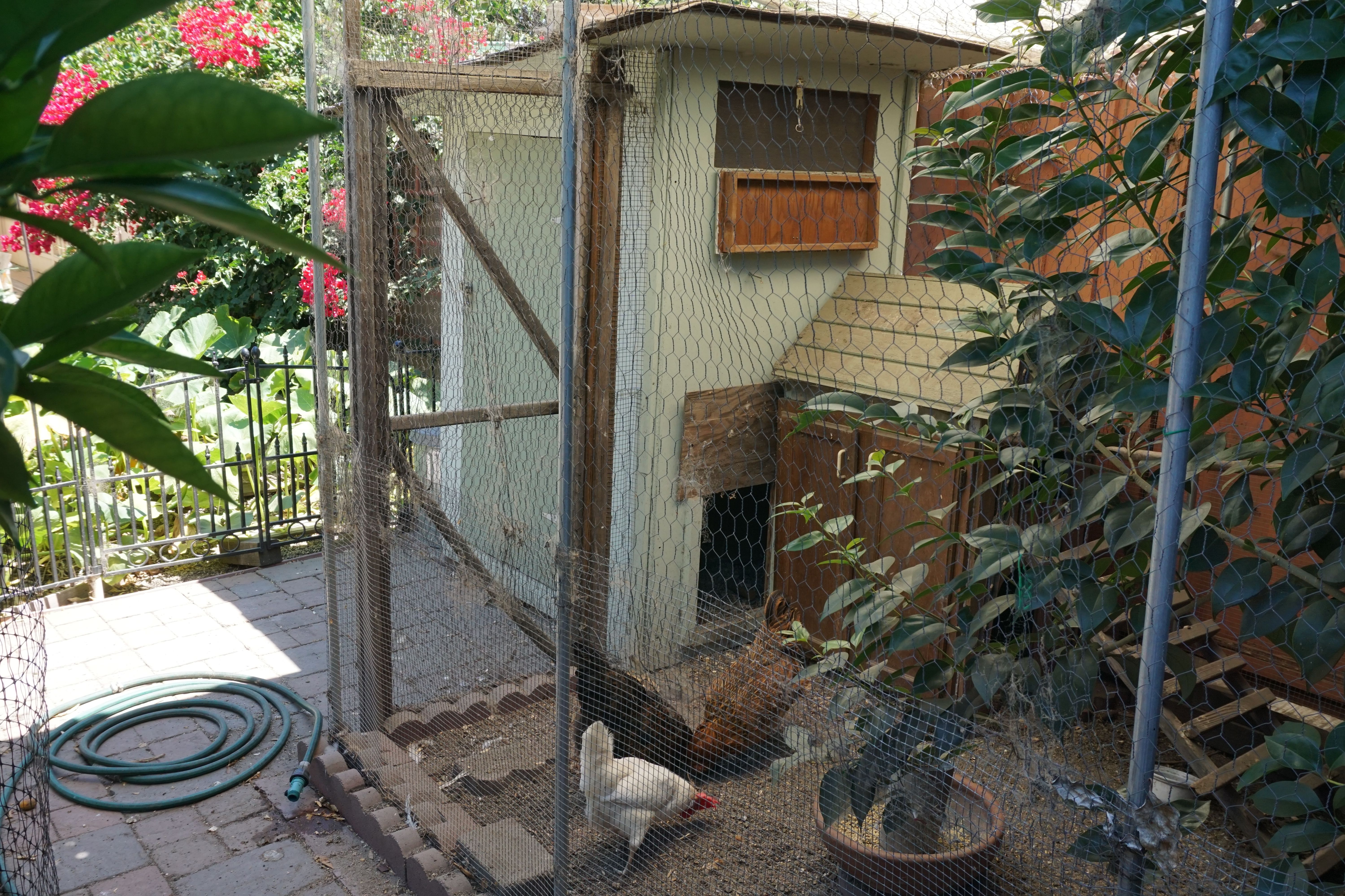 We have a coop that we built in 2003. A predator-proof pen is attached to the coop for free access for the hens. Since 2003 we have lived with 10 different hens, all with different personalities. Our current three hens in residence are ages 7 and 2 and 2. The breeds are Ameraucana, White Leghorn, and Black Sexlink.