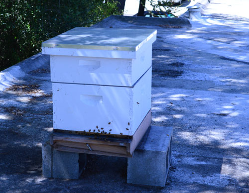 Roof tops turn out to the perfect place to place bees as they make a “bee line” when coming or going from the hive. When placing a hive, you DO NOT want to place the hive entrance at ground level and entrance facing where you pass as the bees will always cross your path and will bump into you!