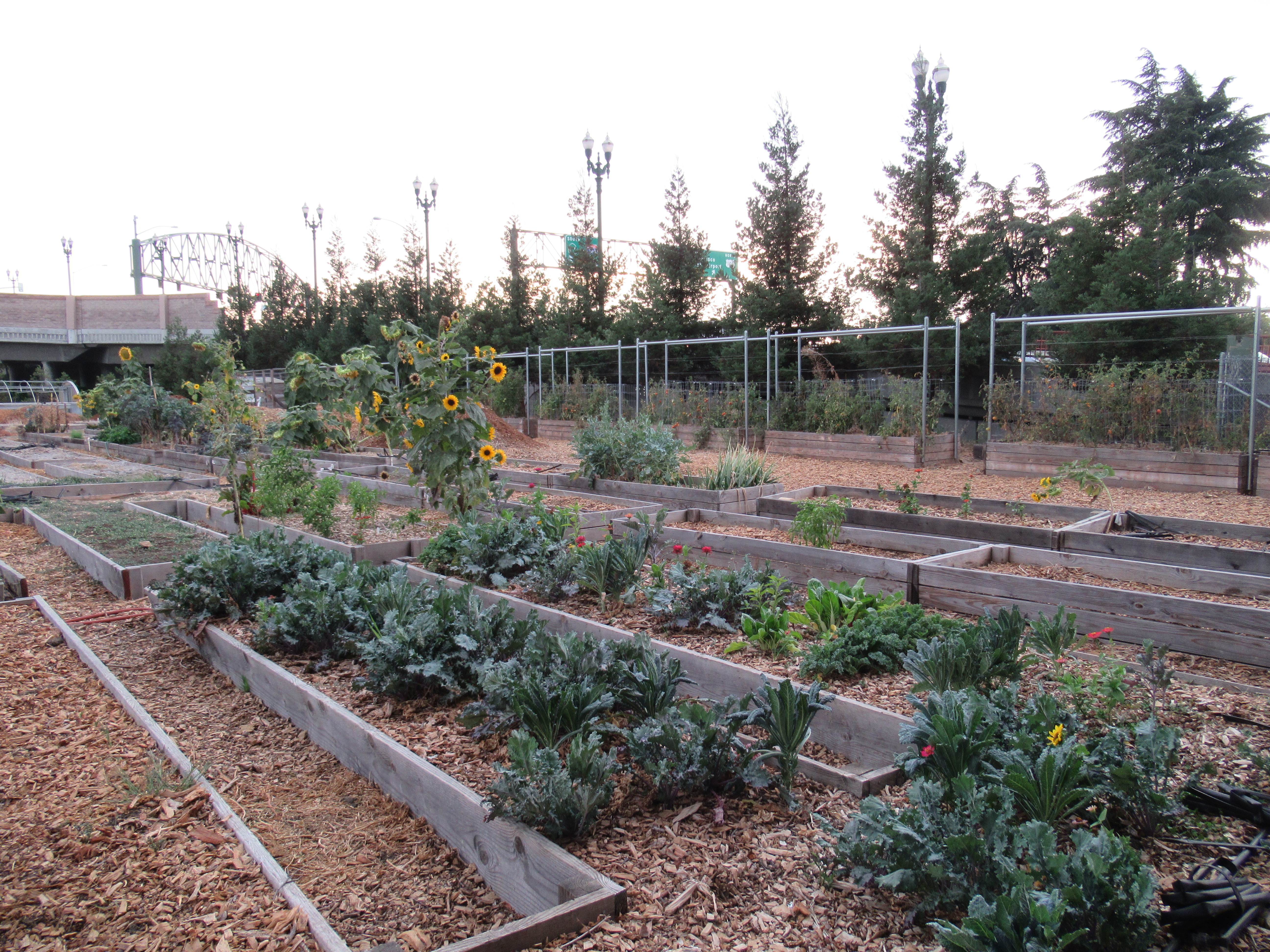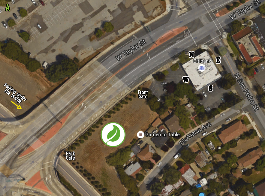 - If you are coming by car: You can either park on San Pedro St. and walk through the CitiBank parking lots to the farm, or park UNDER the W. Taylor St. bridge: coming from California 87 North or South, take the Taylor St. exit and turn EAST onto W. Taylor St. Make your first left at the light onto N San Pedro St., your next left at Hedding St., and another left onto Guadalupe Parkway. Almost immediately after you cross Mission St., you’ll see a long chain link fence to your left. The entrance to our parking is at the end of the fence. You can park under the bridge underpass, and find our farm entrance at the corner.