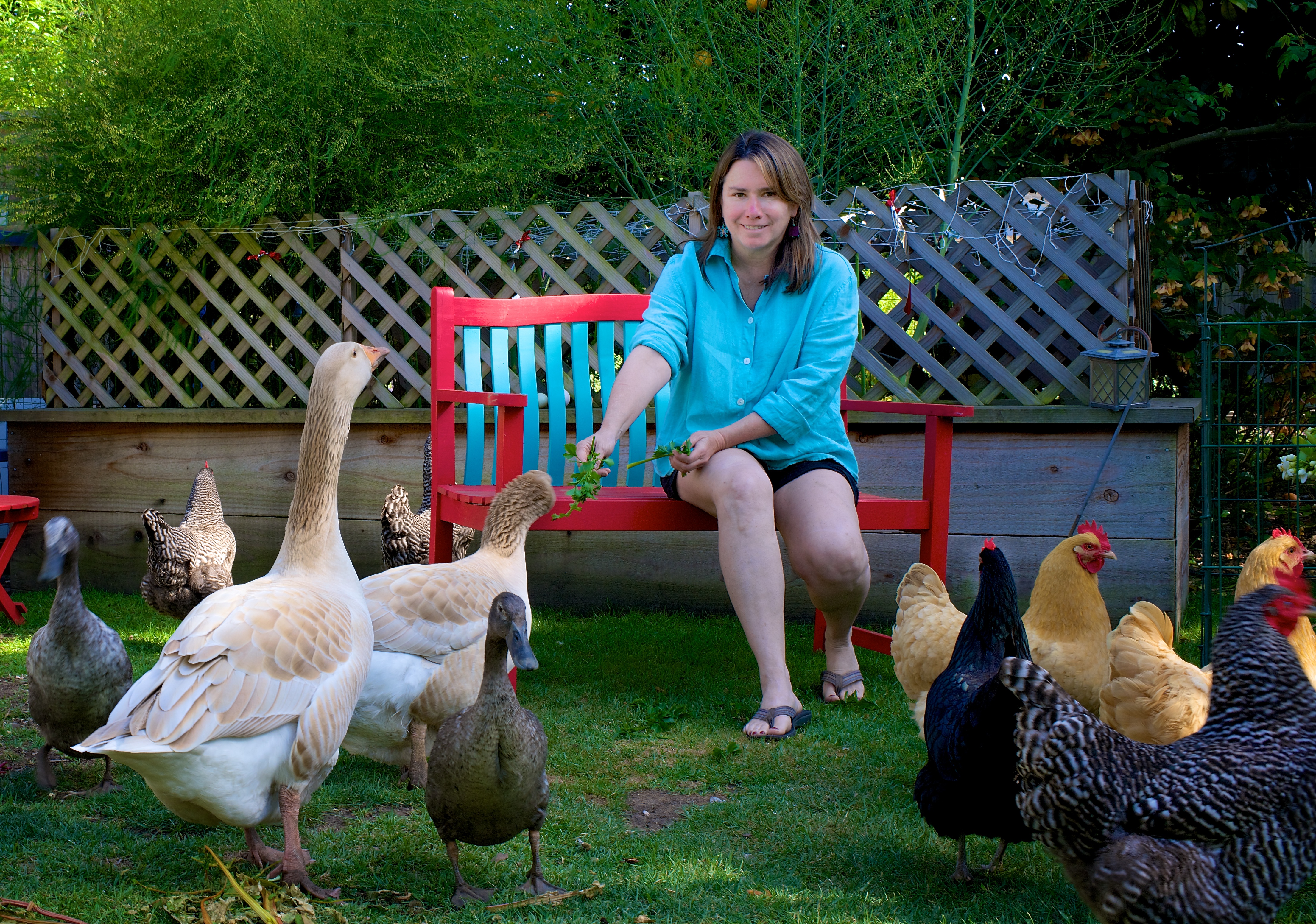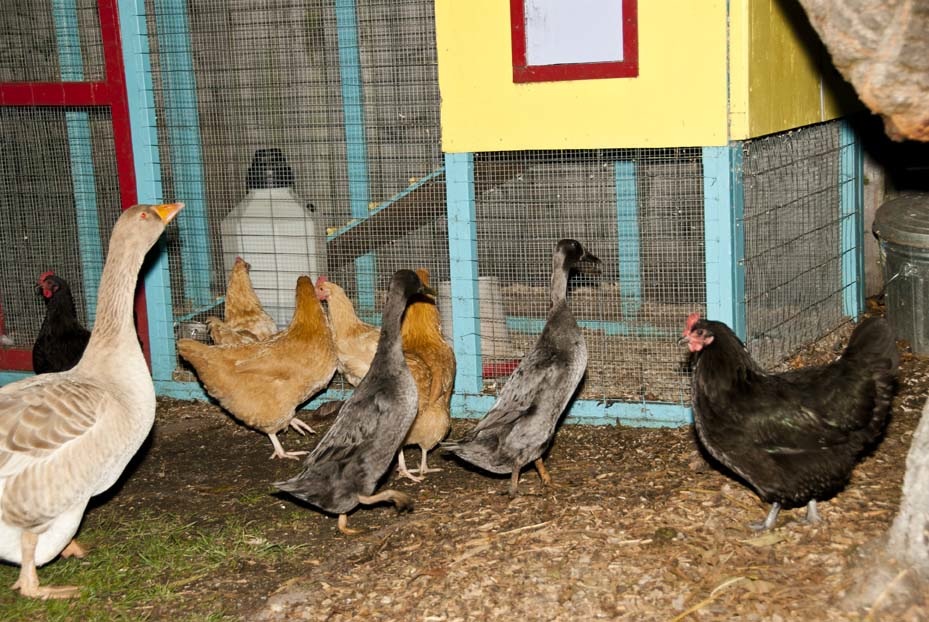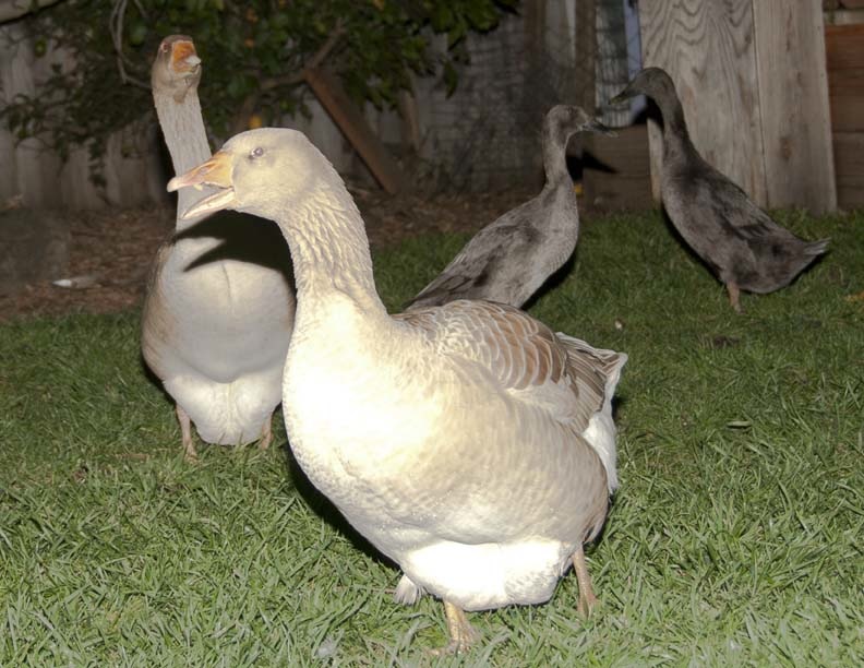 I have 2 geese (“Albert” the American Buff gander, and “Ernestine” the Toulouse goose), 6 Indian Runner Ducks, and 11 chickens. In four separate hutches, which are not wholly adequate space-wise for the flock, but we are working on that.