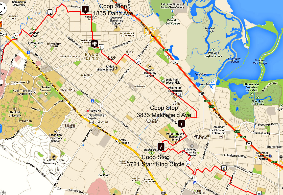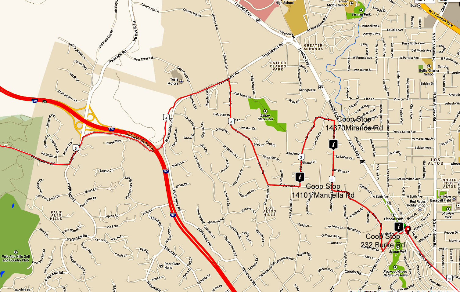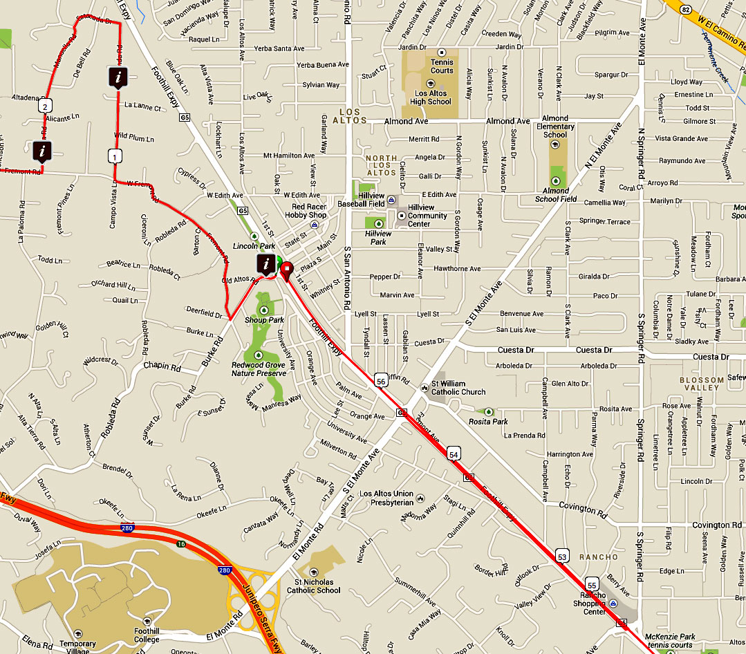 Starting location: This tour starts near downtown Los Altos at Lincoln Park at 199 University Ave, Los Altos but we recommend you start the route anywhere along the route to prevent parking concentration issues. There are restrooms in Downtown Los Altos at businesses and a block away at Shoup park.