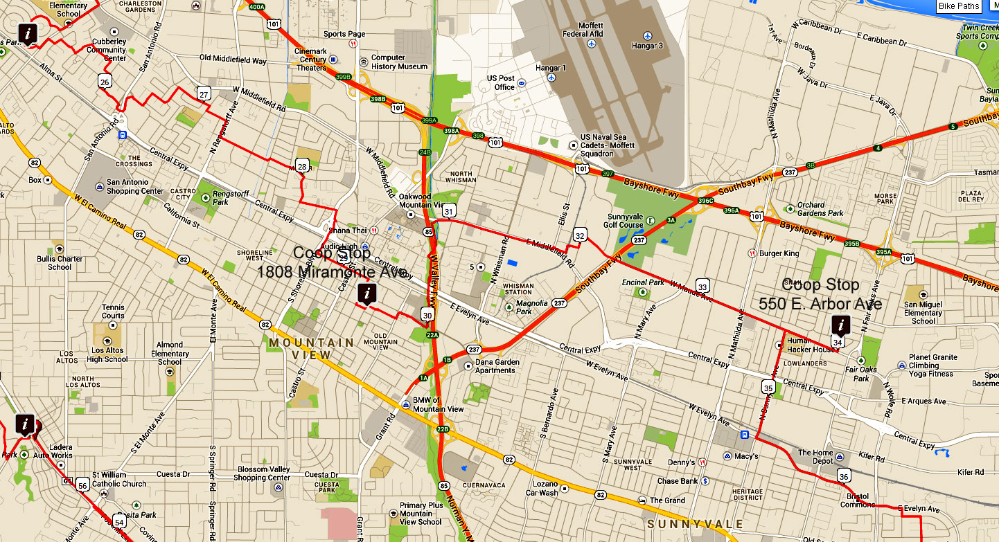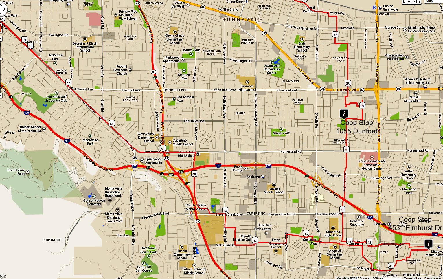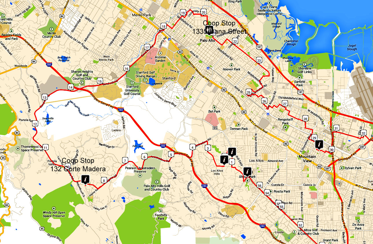 This longer (56 miles) tour is for the more serious cyclist and includes about 12 coops. It uses a combination of smaller residential street and also uses expressways that have bike lanes. It starts in Los Altos and first heads Northerly into Portola Valley and then drops down through Palo Alto, Sunnyvale and into San Jose and over the famous Don Burnett bicycle bridge over 280 and returns back to Los Altos.