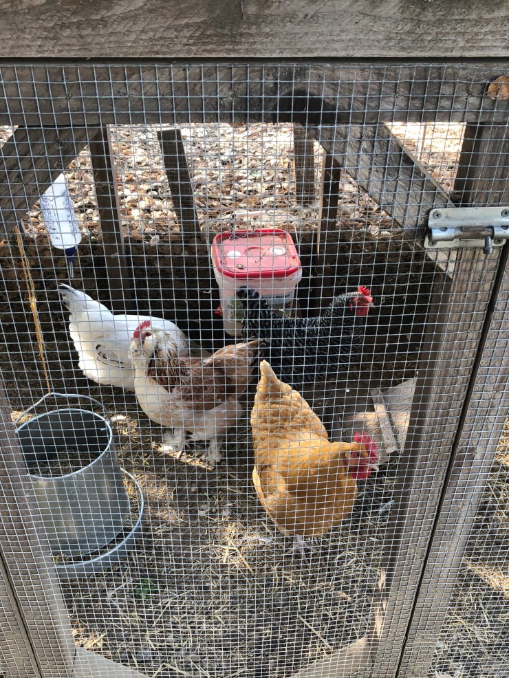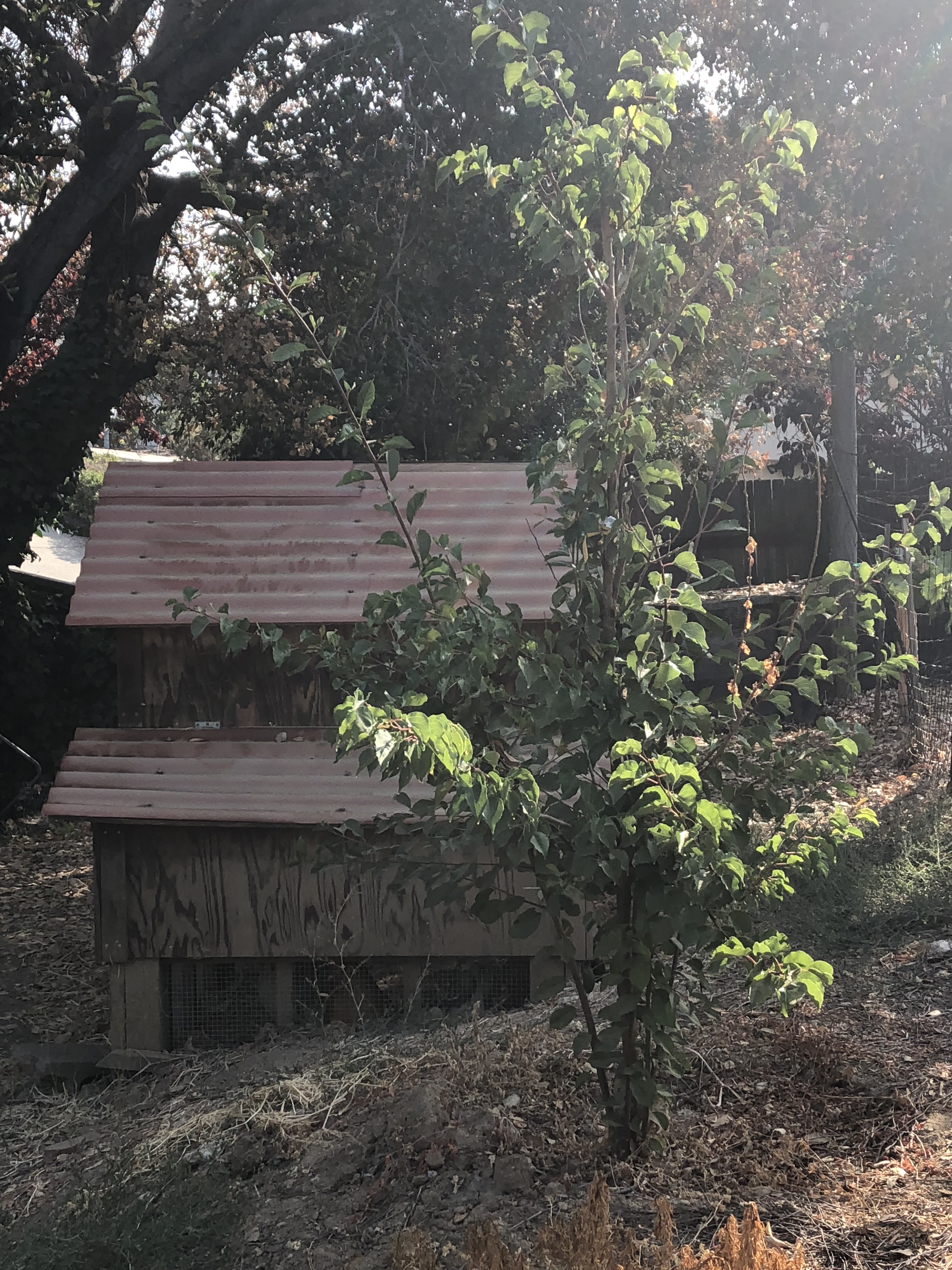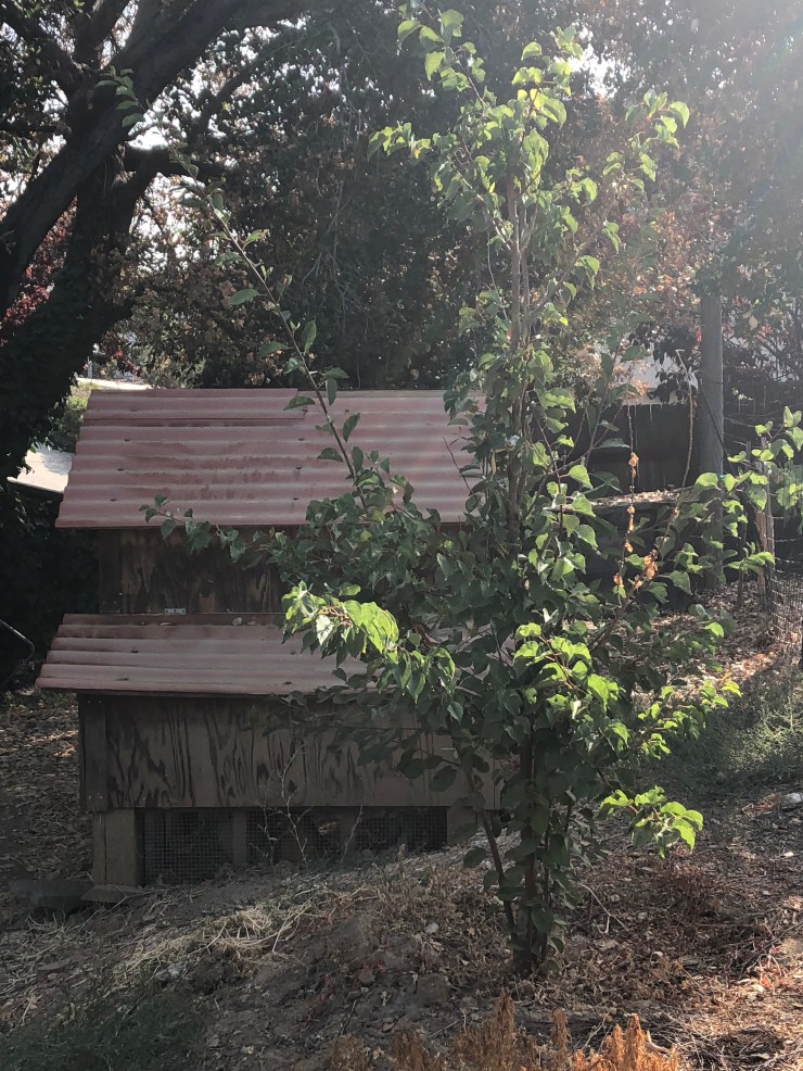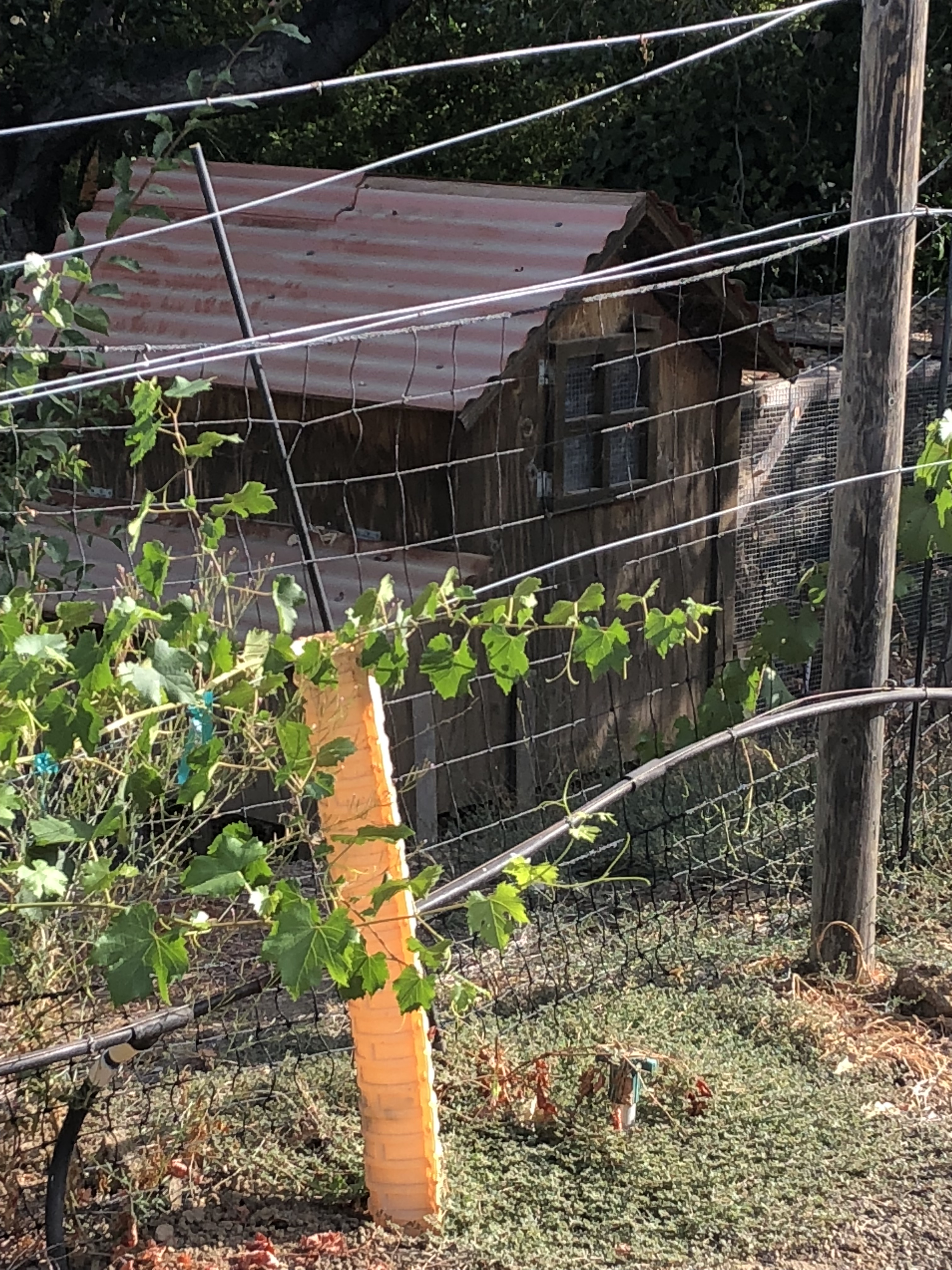 Cute coop and run at bottom of small vineyard. Composting bins nearby for straw from coop. Compost used in garden growing boxes nearby.