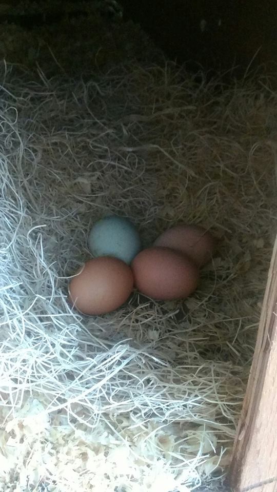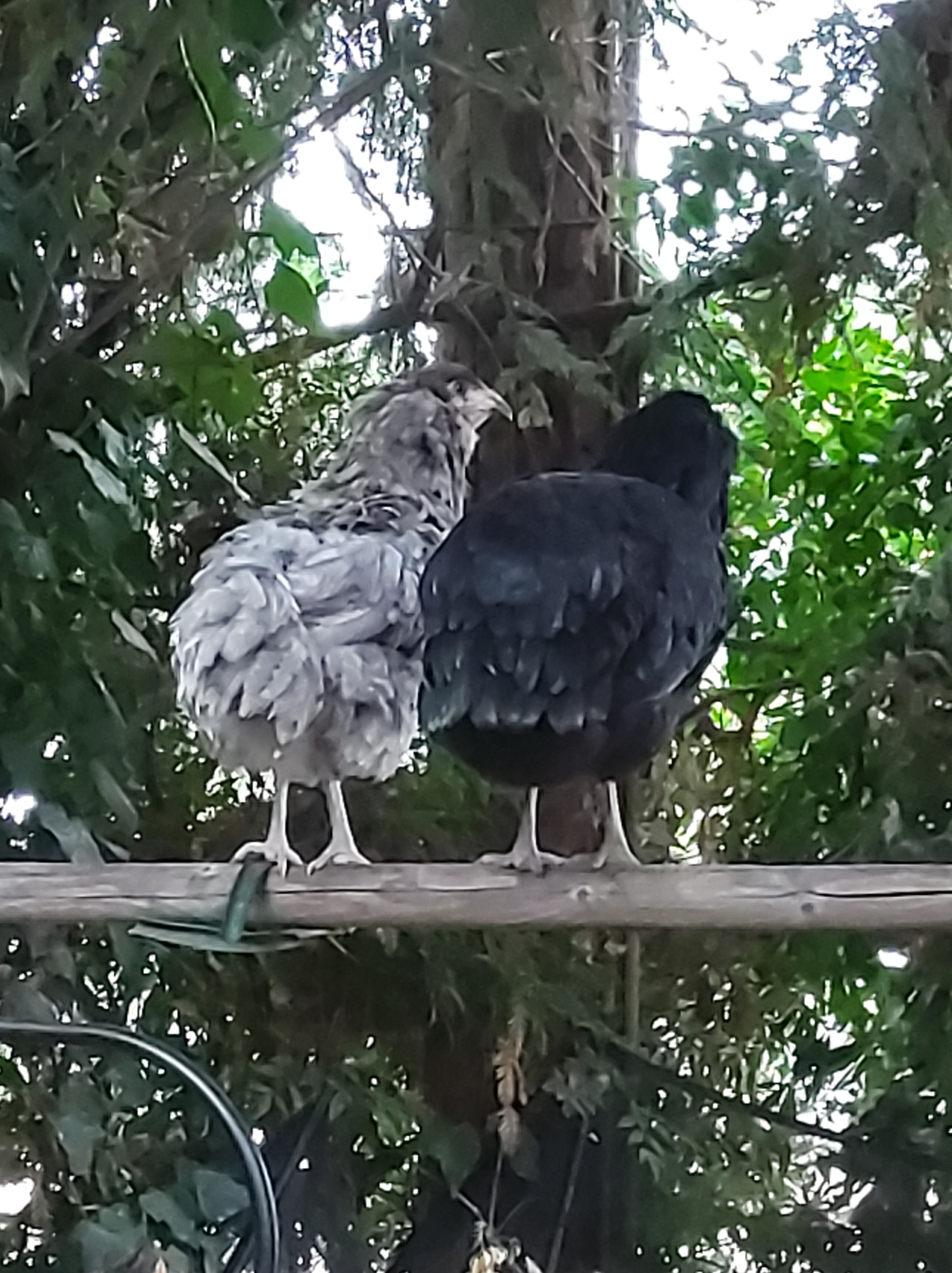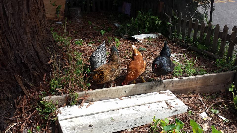 Four chickens in a custom coop (made by Alta Vista High School across the street) with run