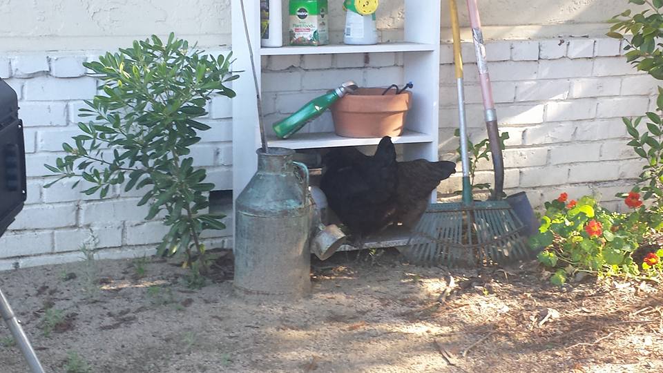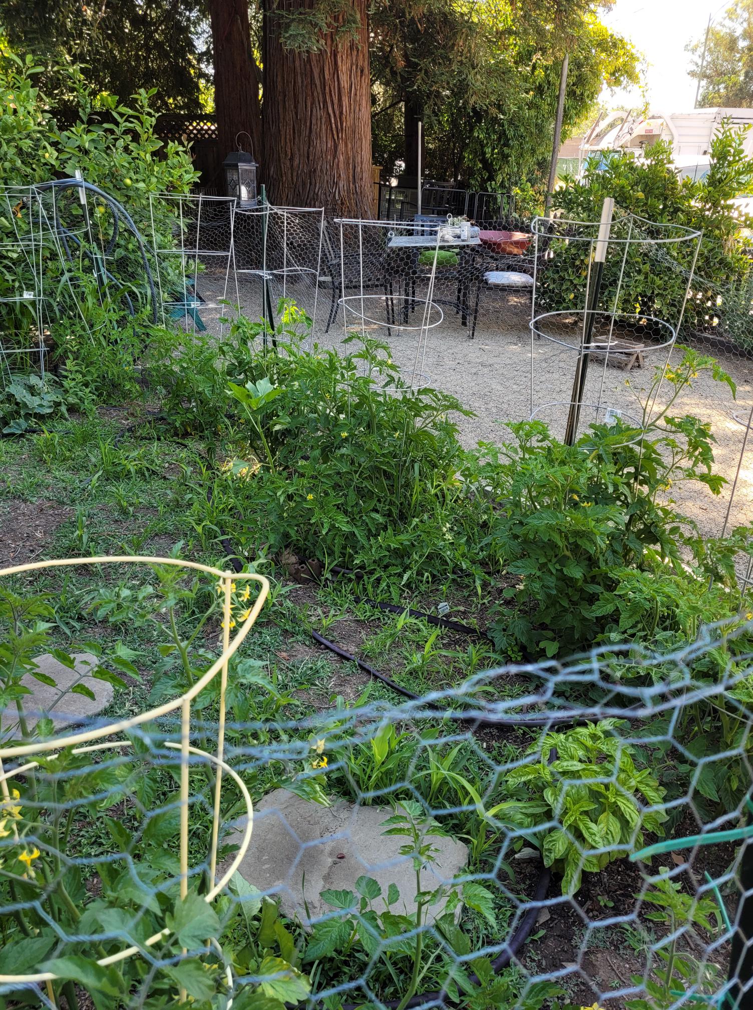 The other side of the yard, planted fruit trees, vegetable garden, decomposed granite, and sitting area with a small composting area. We let the chickens out in the front yard for weed, snail, and bug abatement.