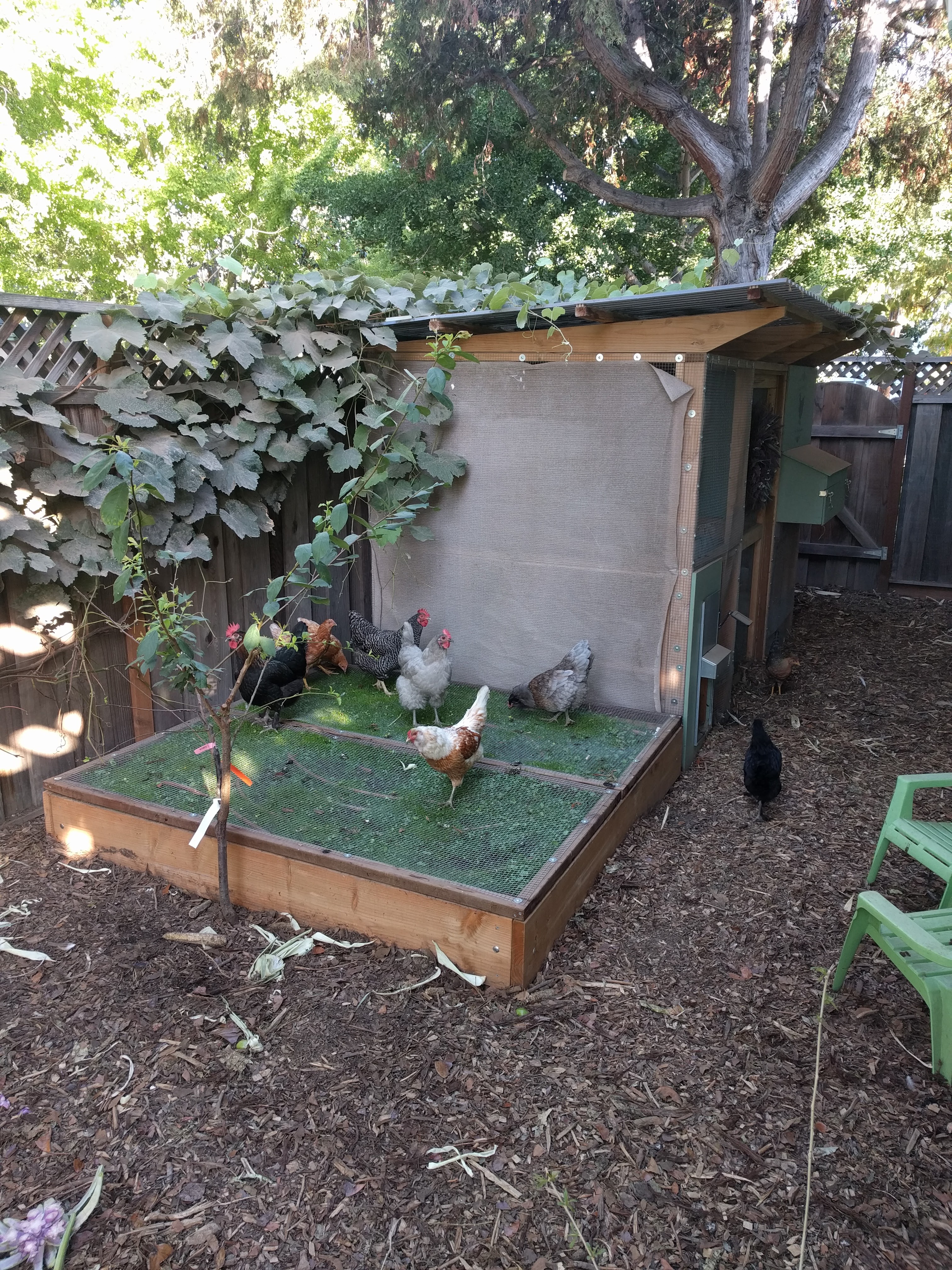 Chickens get hot in the summer because of all the feathers. They can die if they get too hot. I put shade cloth in strategic places to keep them cool. Orchard Supply sells it by the foot. Costco also sells a shade cloth triangle that was handy for covering the run.