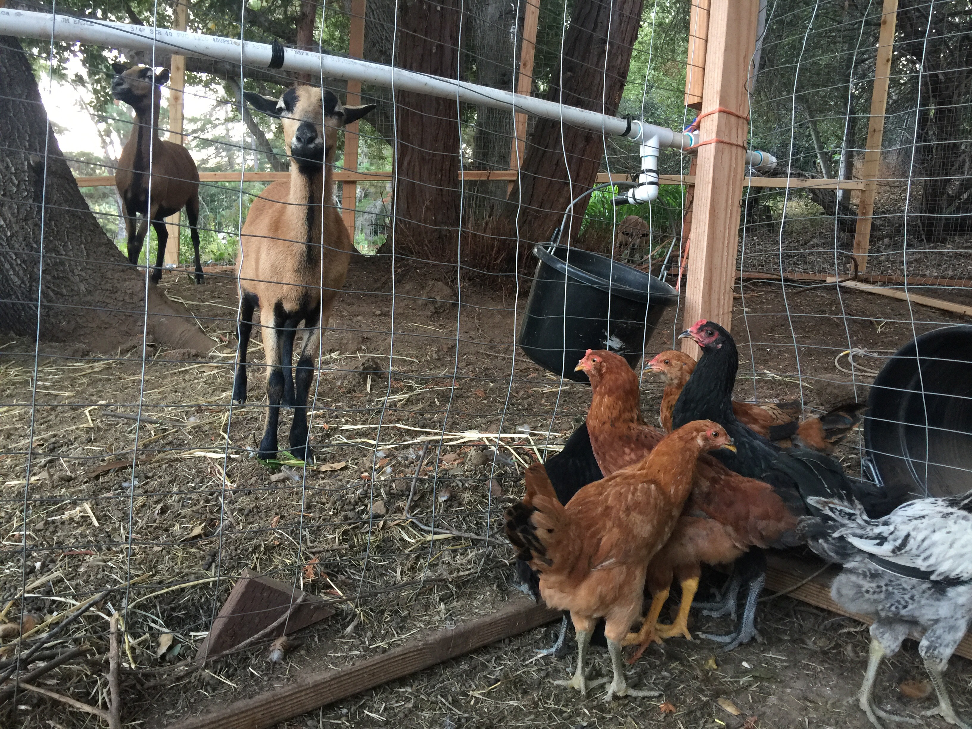 - Coop with 15 chickens, also have 6 sheep (which look like goats!)
