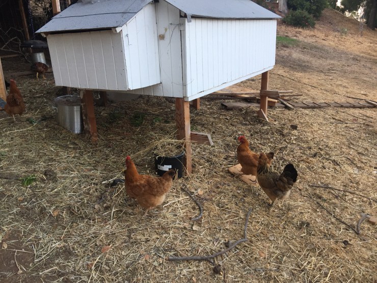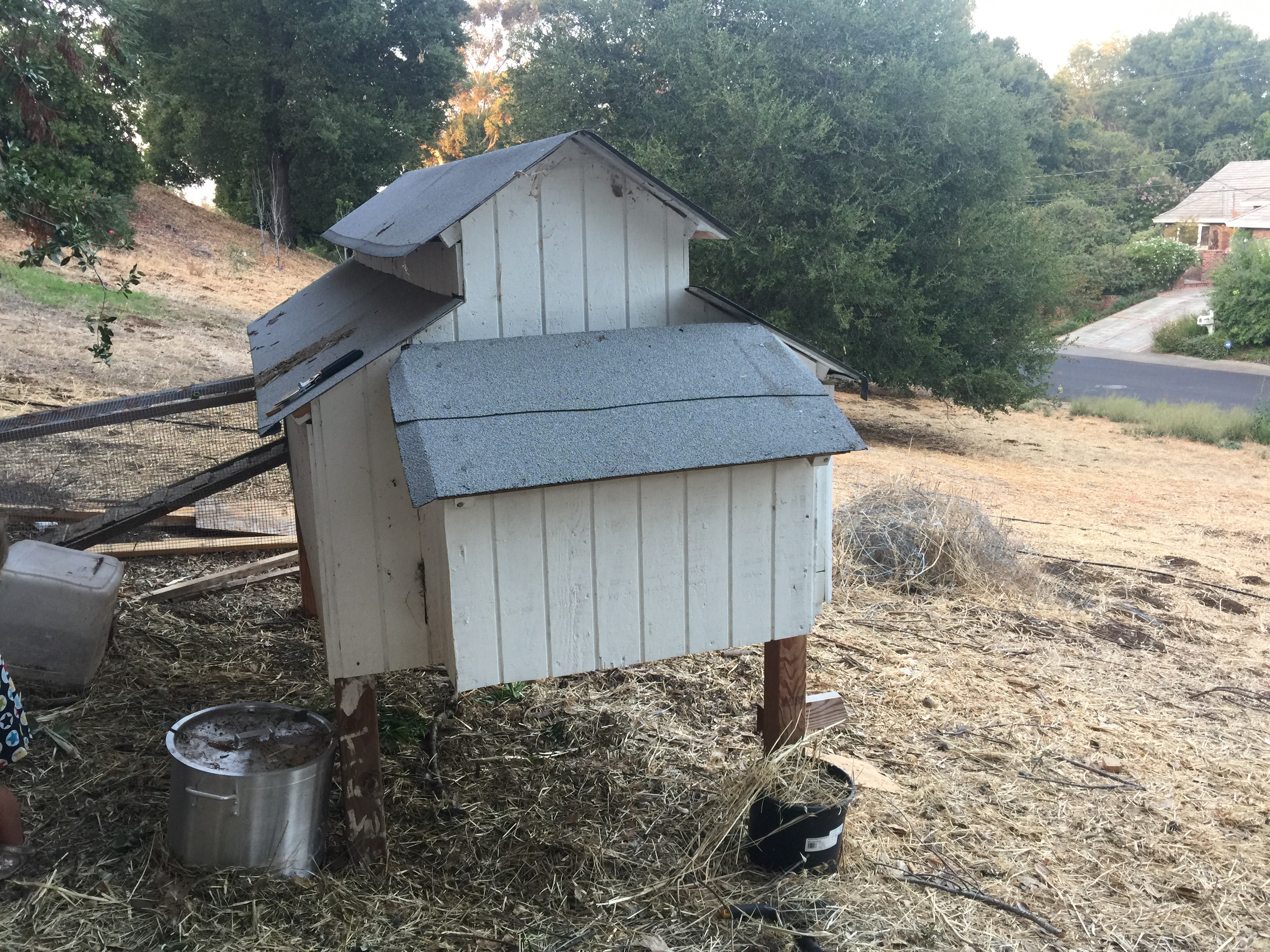 - Custom built coop (by us) in a hillside fit in between trees (more protected from sun and predators)
