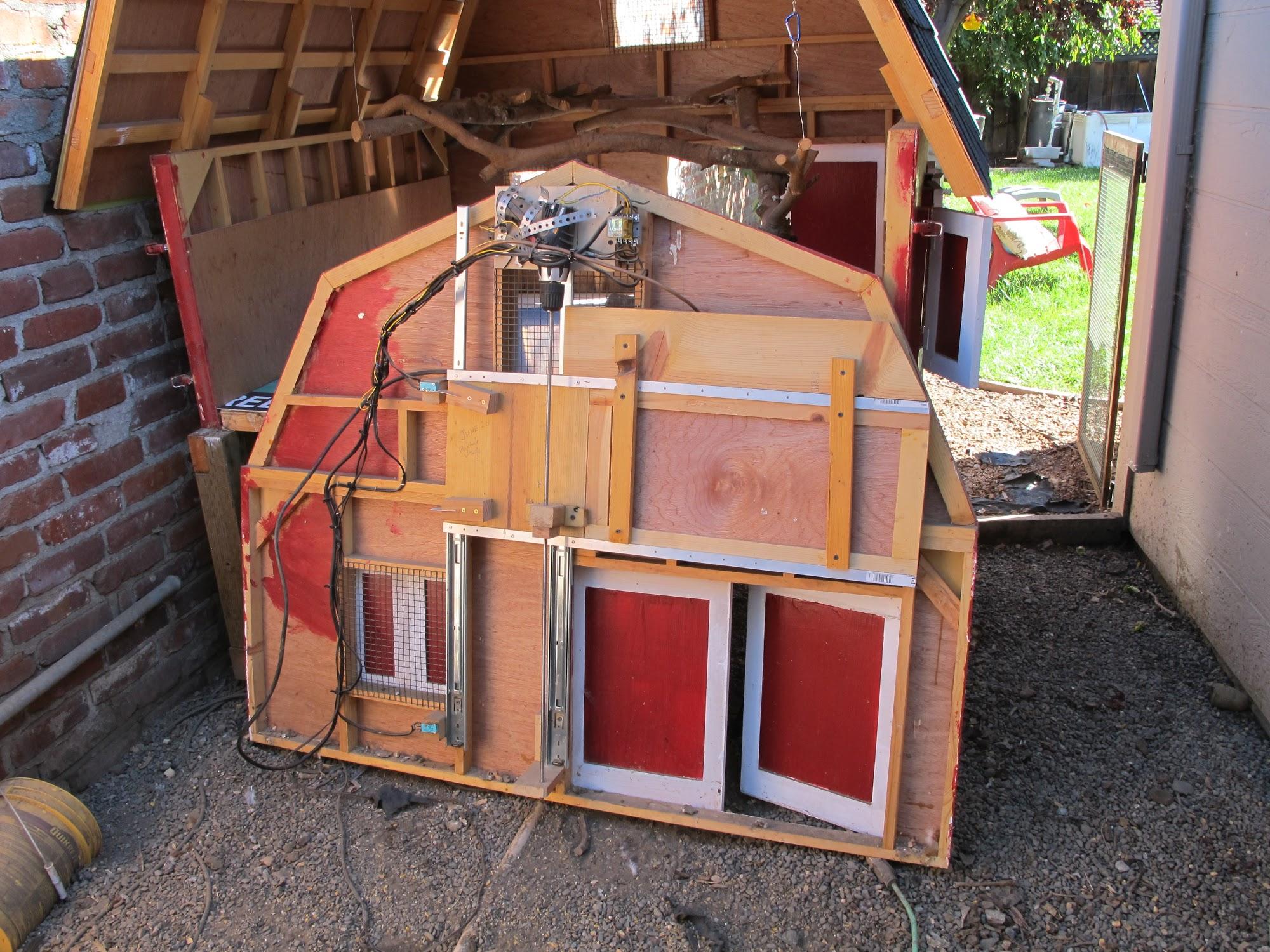 - The automated door opens at dawn and closes at dusk. This security measure locks the hens in at night protecting them from predatory attacks. This was built using commonly found parts; a discarded cordless drill and a simple Christmas light timer. The door rises at dawn releasing the hens to begin their day foraging bugs and yard clippings. Before the autodoor, the hens would begin clucking and cackling at the break of dawn upsetting anyone who was attempting to sleep nearby.