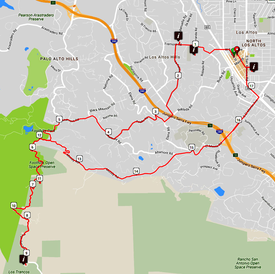 This ride has about 2000 feet of vertical climb with 3 coops in Los Altos Hills and Los Altos.