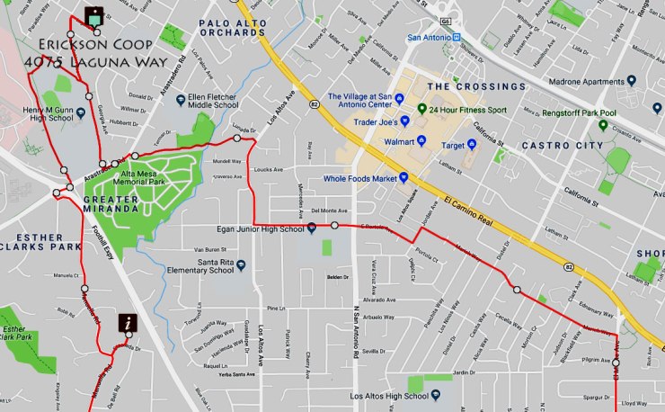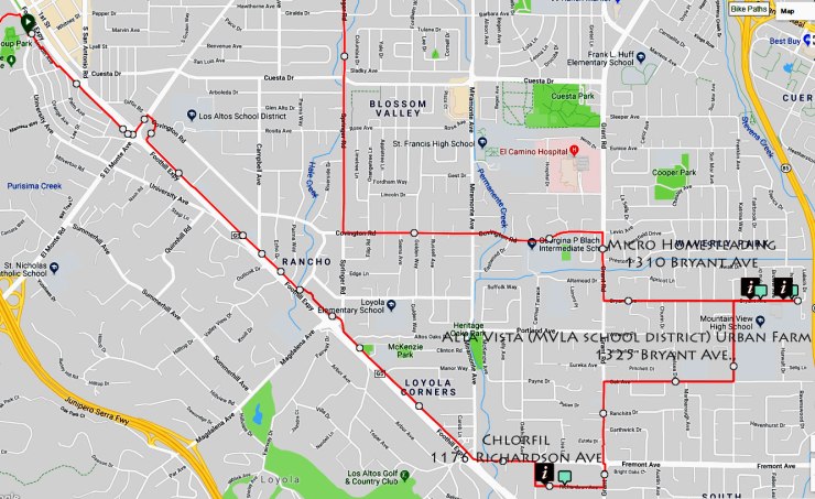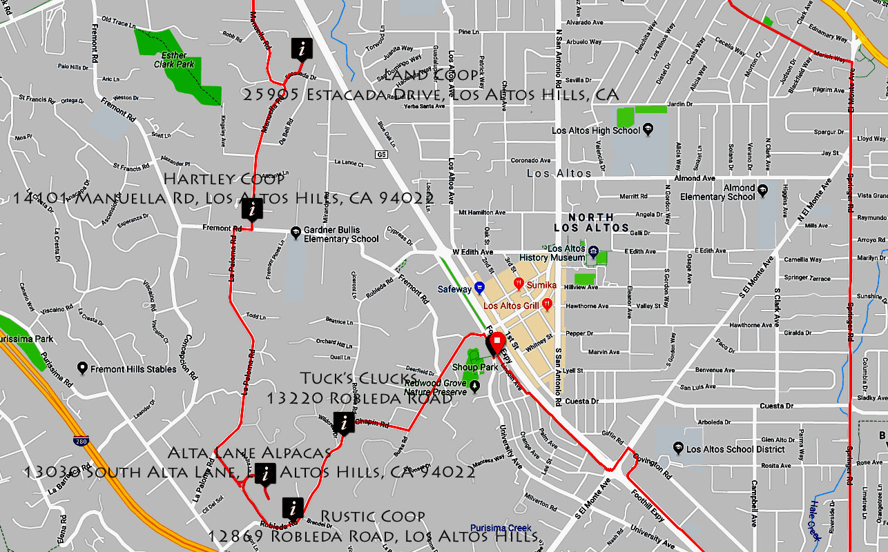 This tour also starts at Shoup Park in Los Altos and visits 5 coops in Los Altos Hills that has some hills, 1 coop in Los Altos, 1 coop in Palo Alto and 2 coops in Mountain View. This has a fair number of coops and some nice riding through Los Altos and Los Altos Hills, Palo Alto, and Mountain View.