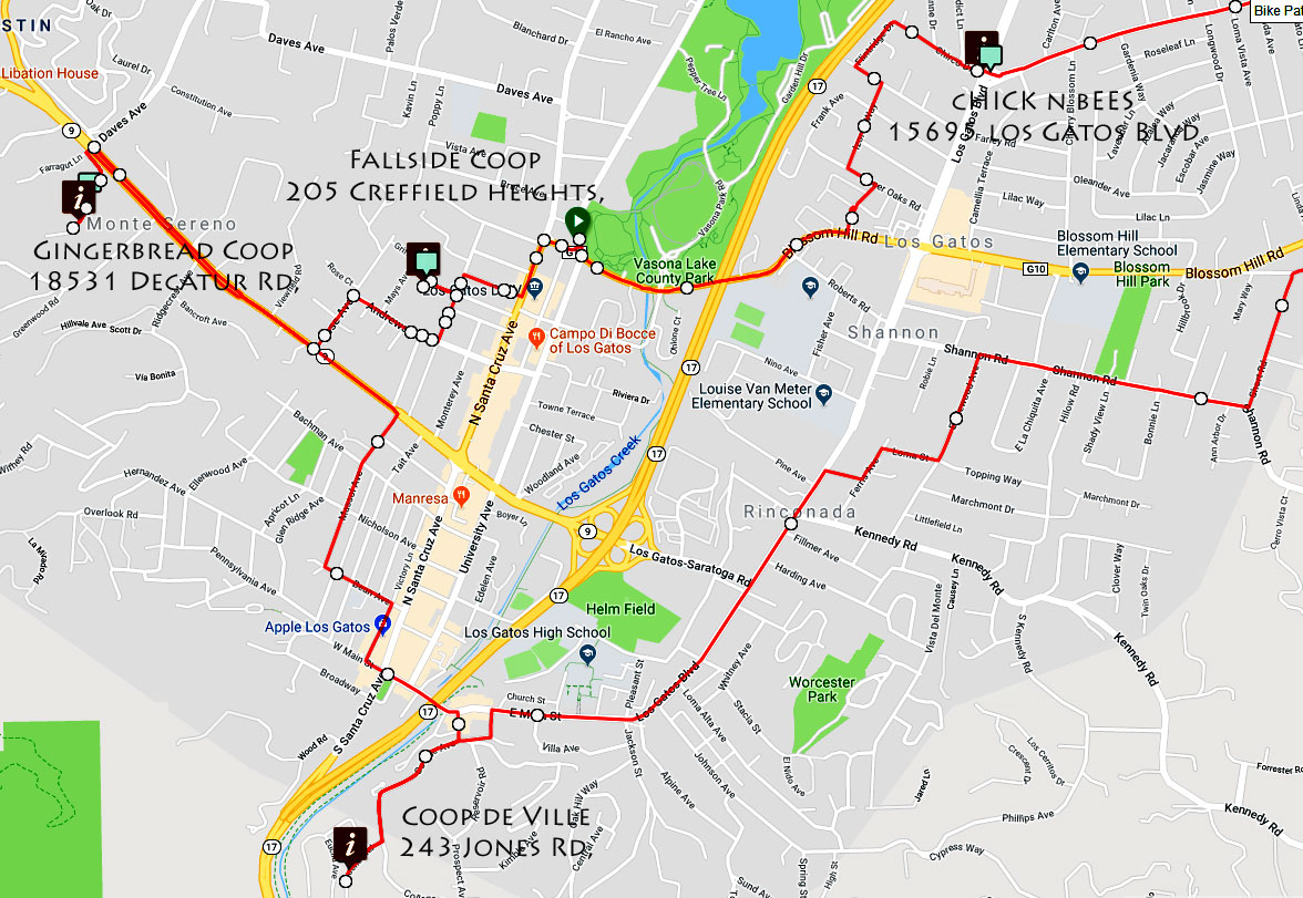The Los Gatos Area coop tour this year is filled with a large number of coop stops within a reasonable biking distance and lots of places to stop for lunch, restrooms and coffee along the way! It includes coops in Los Gatos, Monte Sereno, and San Jose.