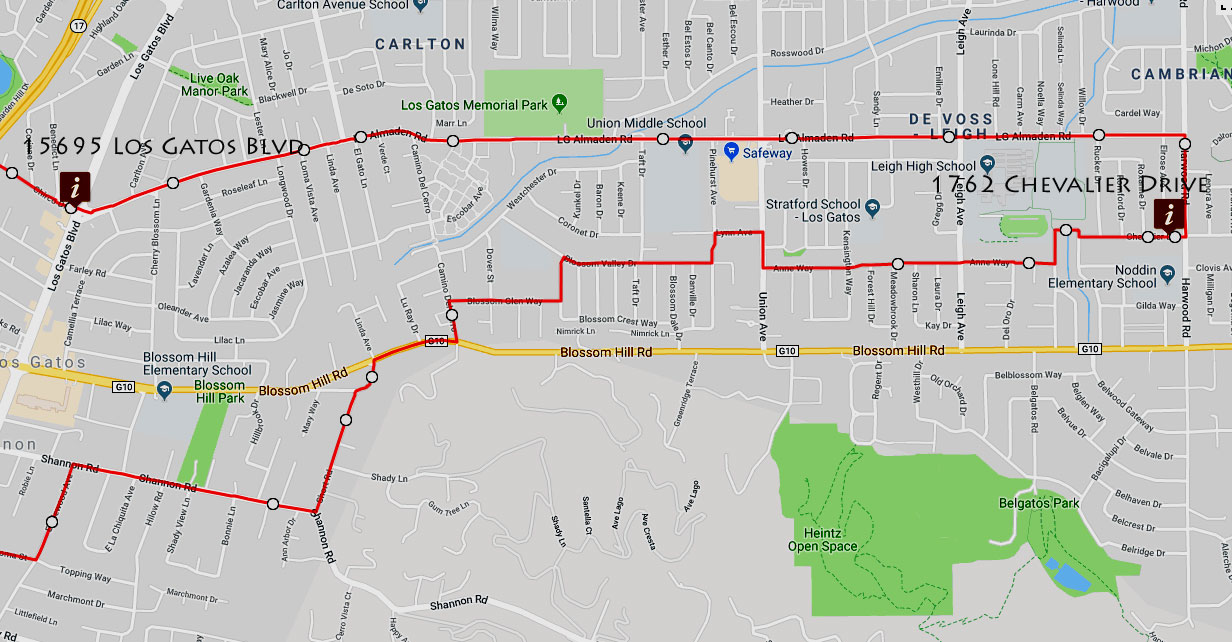 This loop starts at the corner of Vasona Lake Park, at the corner of University and Blossom Hill. There is typically available parking on University Ave. You could also bike up the Los Gatos Creek Trail from the San Jose area and start this loop. There are restrooms at the start inside of Vasona Lake Park