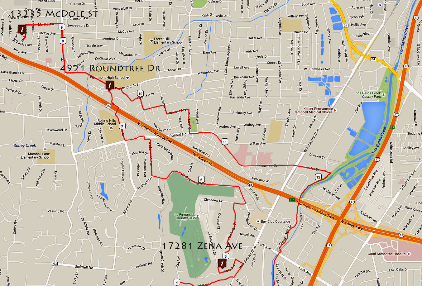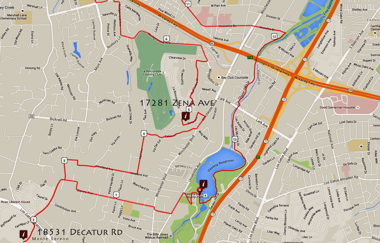 This tour has 4 coops and 13.9 miles of biking. This ride starts at Visona Park in Los Gatos next to Hwy 17. It involves some 580 feet of climbing to get to some coops in the hills.