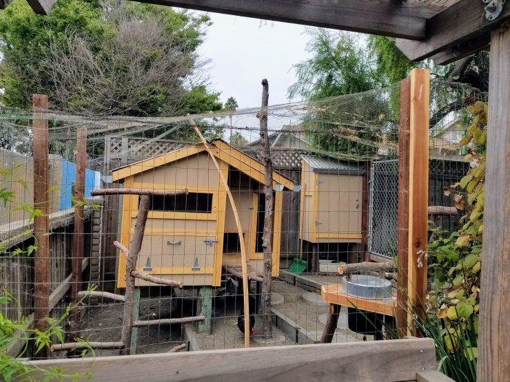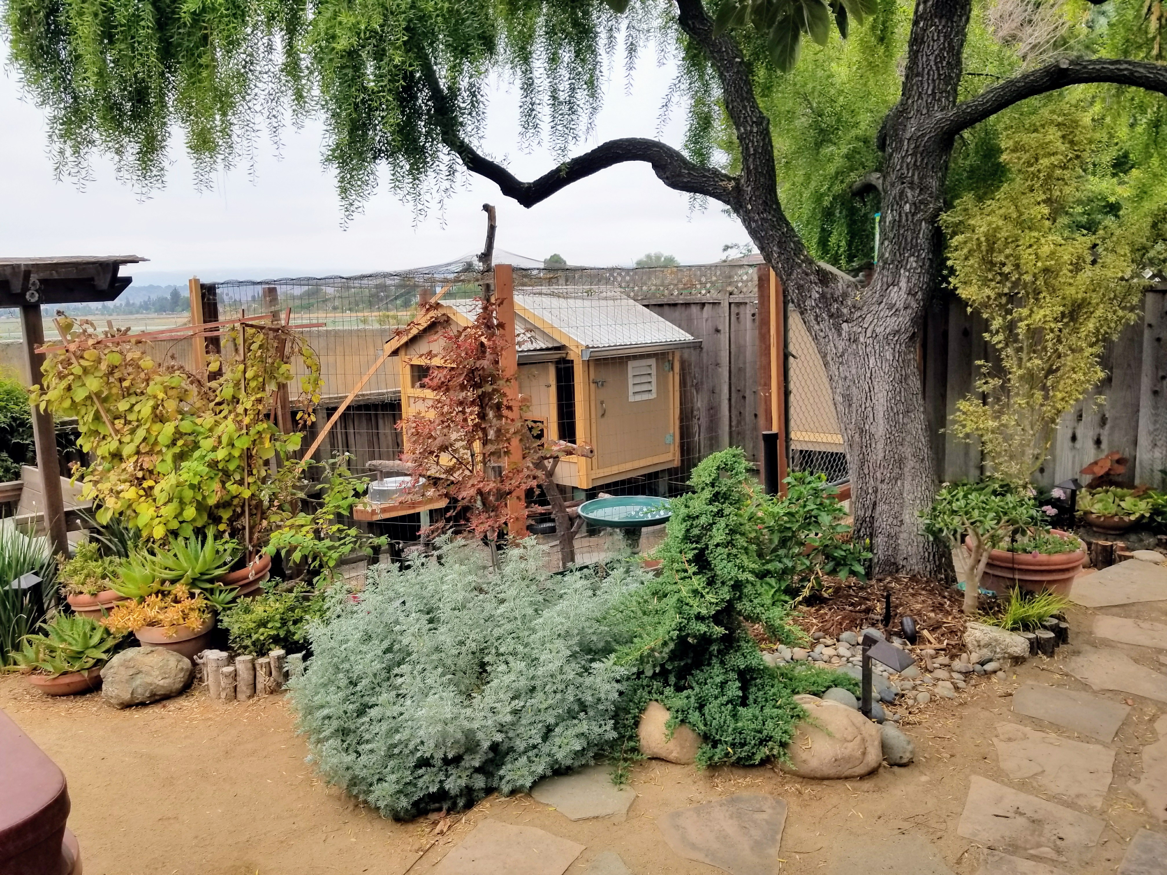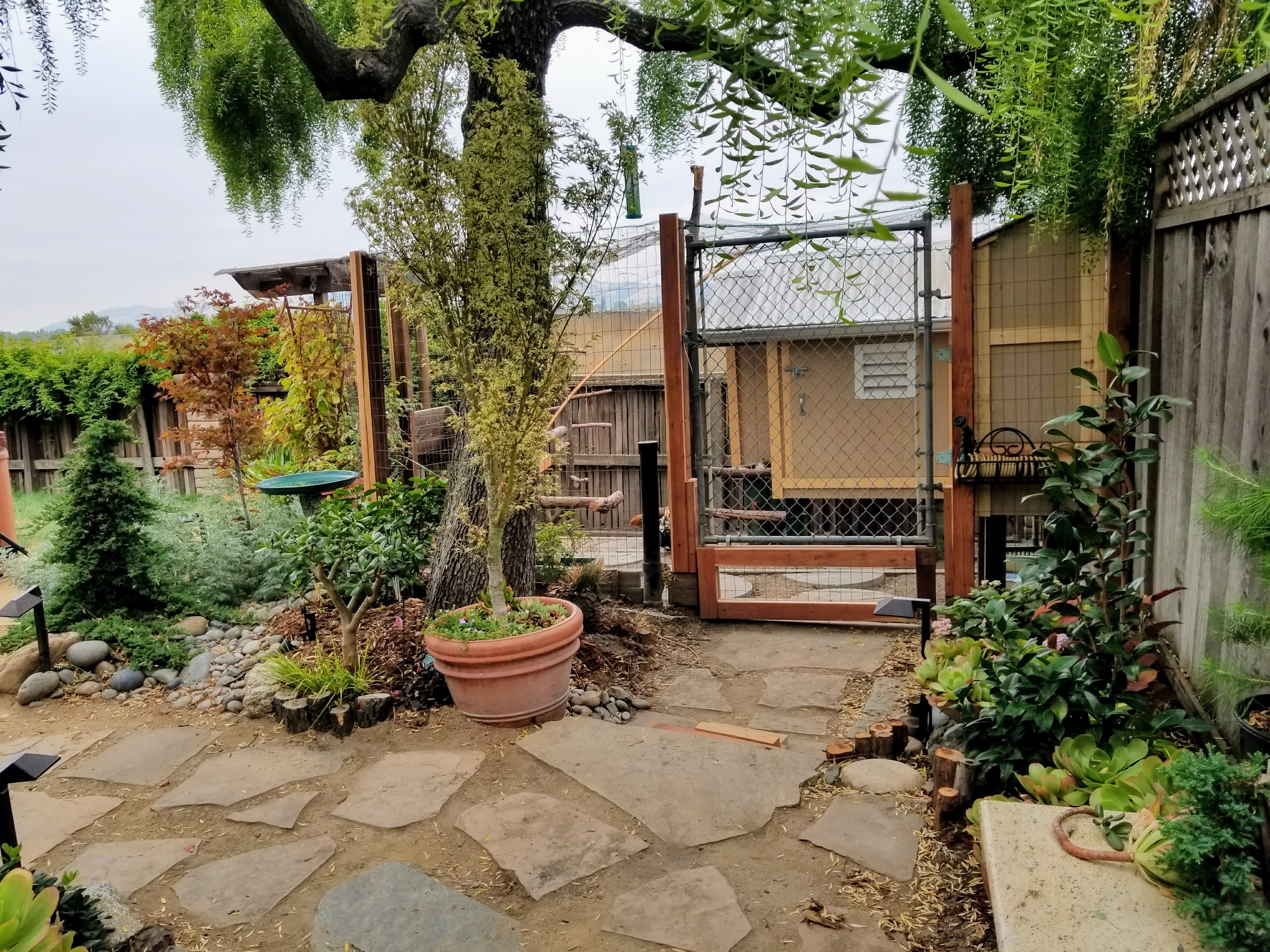 chickens into a tranquil suburban yard that’s made for relaxing. Sit down, take a break and take in the nature all around. Enjoy the view of the surrounding hills, the visiting bees and butterflies, or the chickens in their yard being chickens.