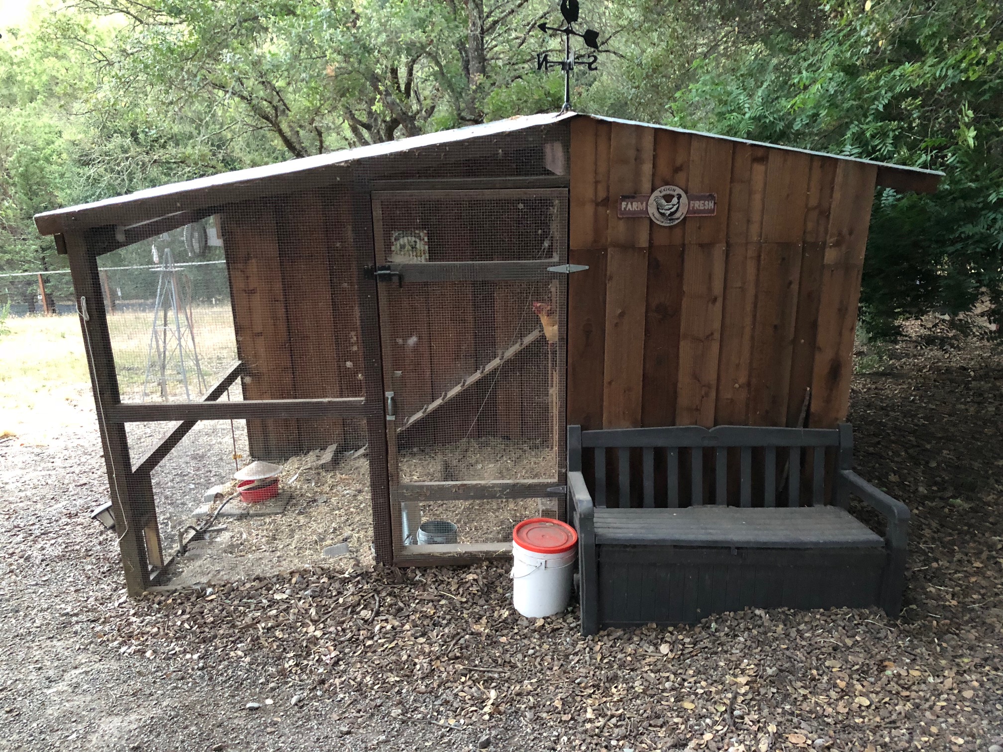 Our rustic chicken coop is built out of redwood with a tin roof and our “daytime” free range chickens seem to be very happy in their home. We designed the hen house with ease of cleaning in mind, and as such, it has a wire mesh bottom which helps to ensure droppings fall in to the bin below the coop.