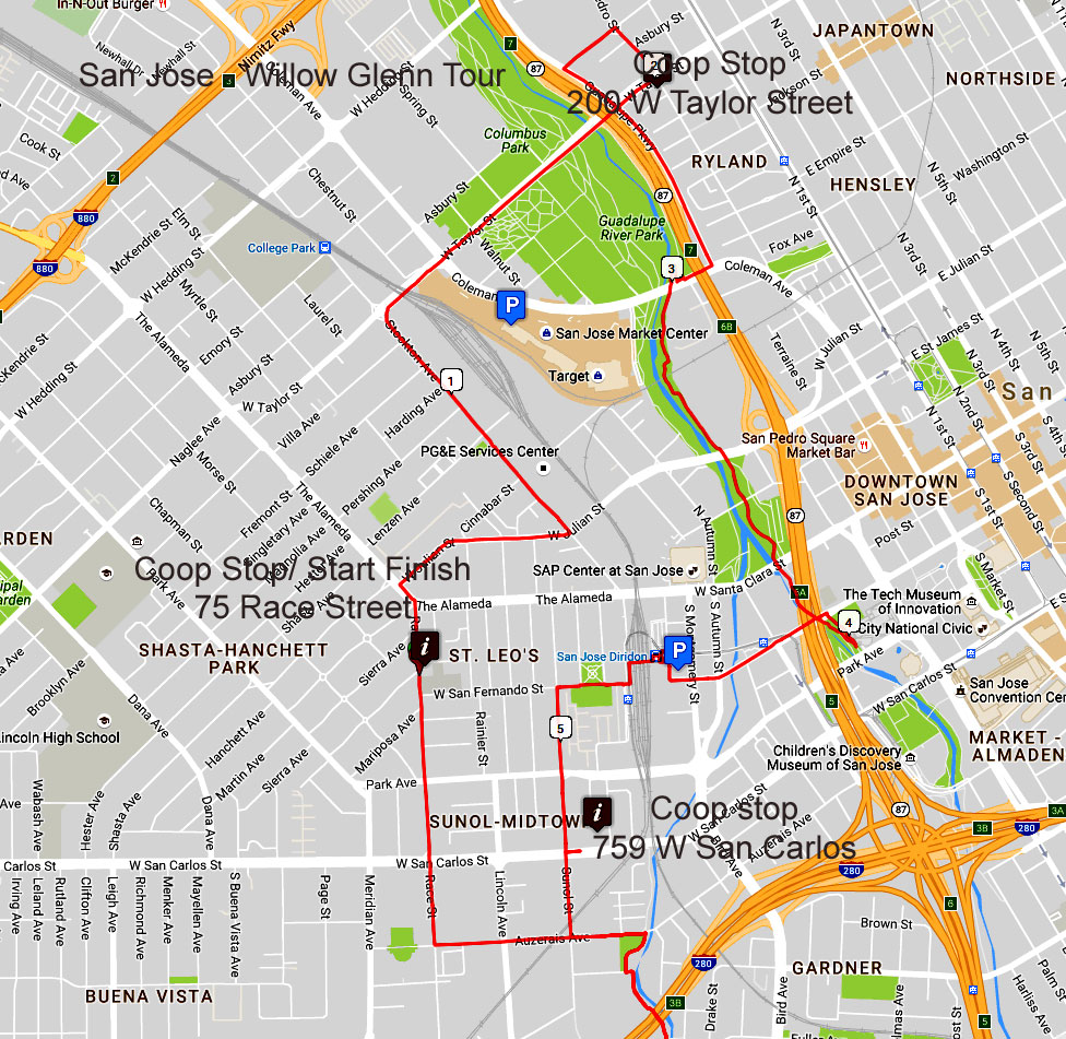 It starts and finishes at Middlebrook Community Garden on Race Street in San Jose. It uses a bike trail to get under Interstate 280 to get between downtown San Jose area and Willow Glen.
