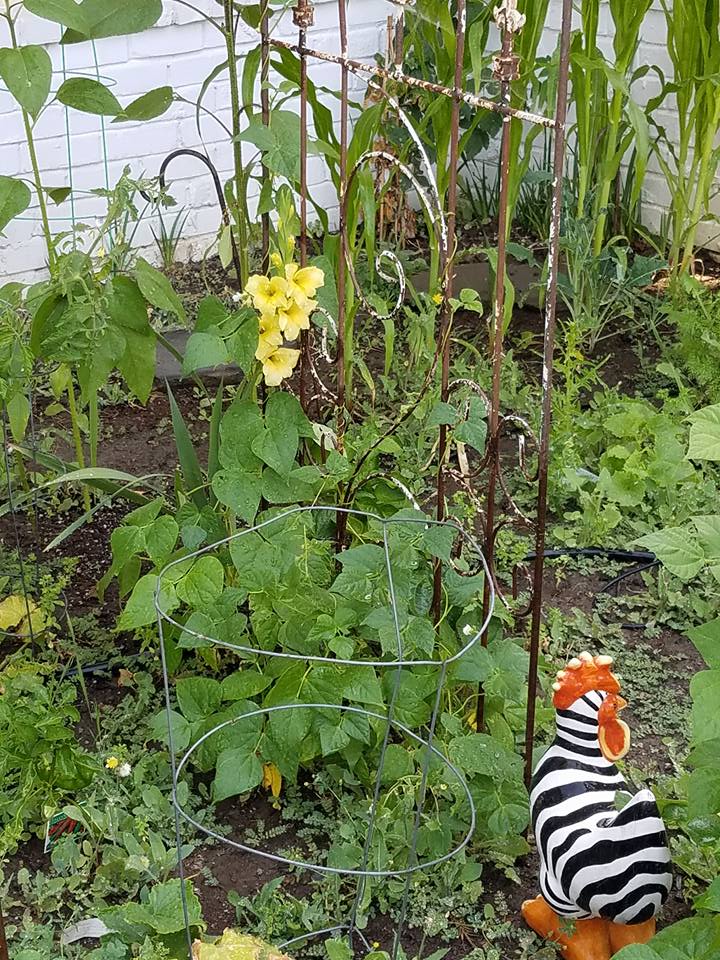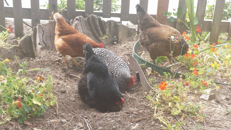 Description: Custom coop, four beautiful chickens, small veggie and herb ‘kitchen garden’, grape arbor, new fruit trees, sitting area with table and native no-mow grass.