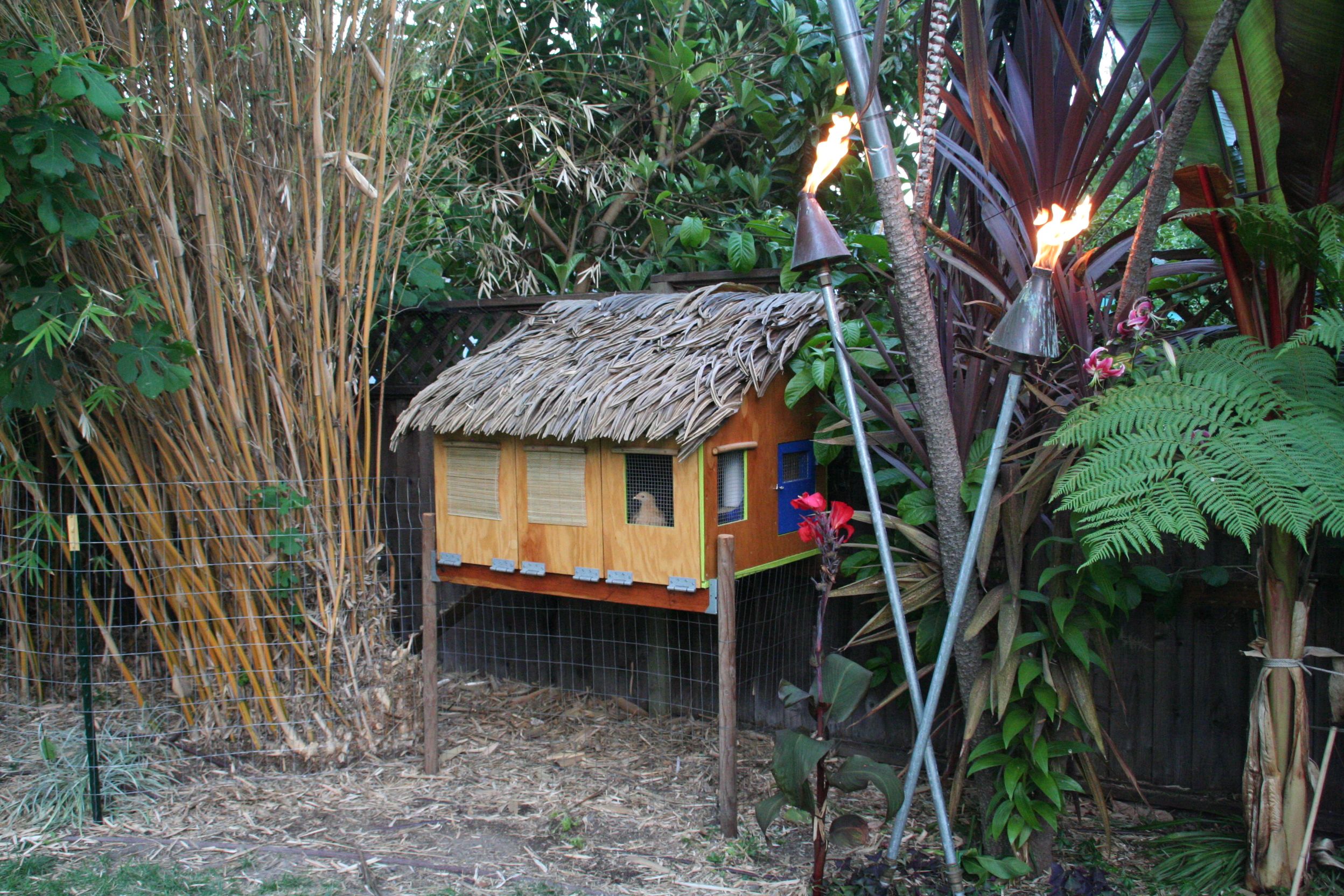 Description: This coop complements the palapa which covers the outdoor bar in our tropical backyard. It is modeled after the over-water thatch-roofed huts you find in the tropics. We designed and built it ourselves, using reclaimed lumber, bamboo from our garden, and plastic thatching. It houses three young hens: A White Marans, a Buff Orpington, and a Silver Laced Polish.