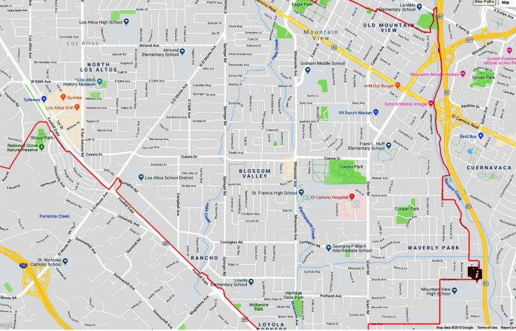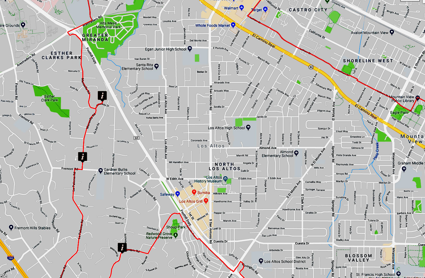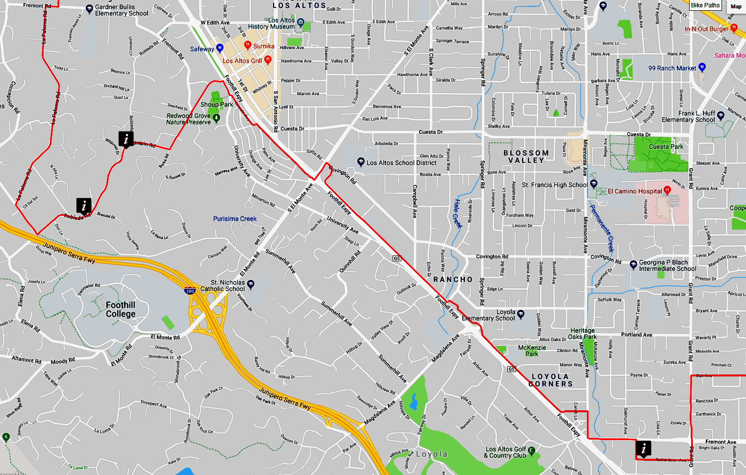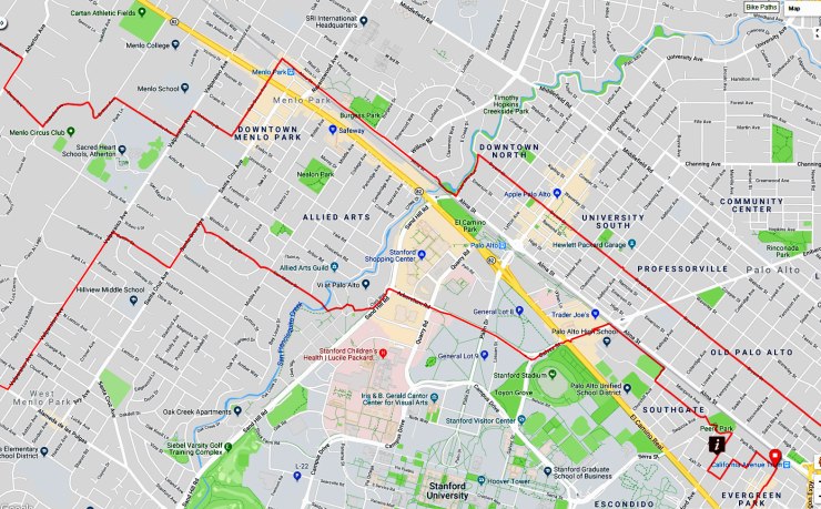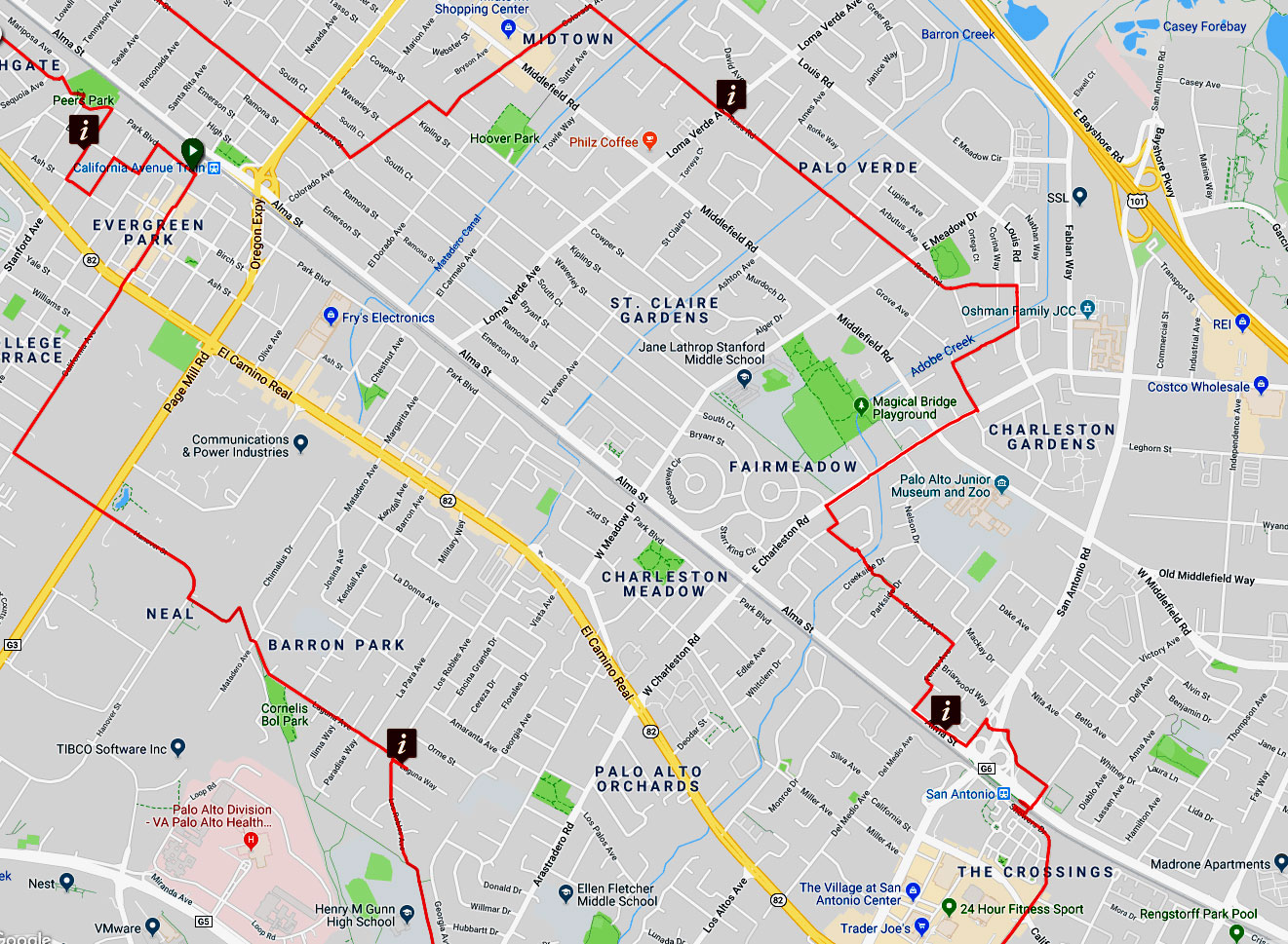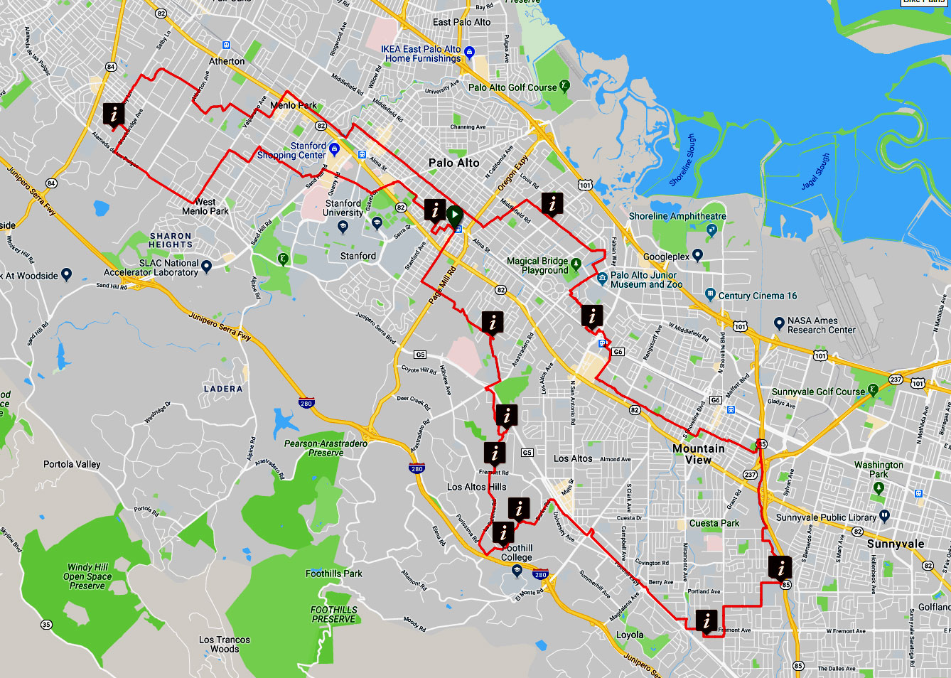 This route starts at the Palo Alto California Ave Cal Train station and takes several scenic bike trail routes and quieter neighborhood street routes. The route avoids busy congested traffic roads.