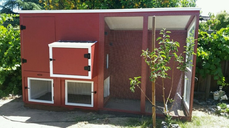 - Our Homemade Barn-Red Coop/Run is a nice example of what can fit into a traditional yard in San Jose for those unsure on how to make use of their limited yard space. This coop and run has been designed to allow for full walk in support for cleaning and maintenance and includes a split door for giving treats and a swing-out door for accessing the eggs in the laying box. The coop & Run Structure is roughly 3ft x 12 ft x 6 ft to allow for up to 6 large chickens.