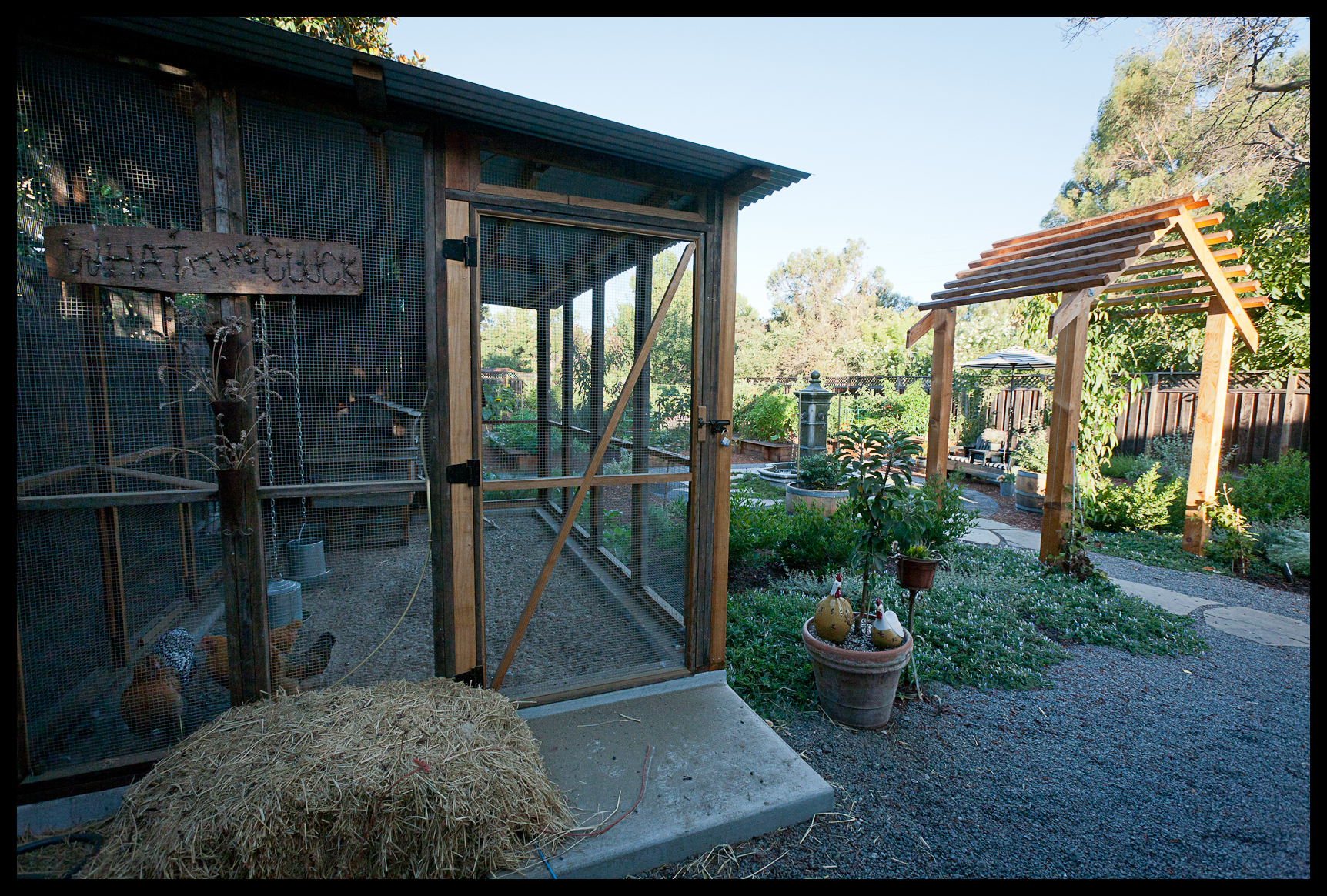 Our girls—Buttercup [a Buff Cochin], Scout, Hushpuppy [both Amerucaunas], and Frida [a Silver-laced Wyandotte]—live in a large, airy chicken run constructed from repurposed wood from an old deck and hardware cloth. There’s an 18”-deep cement curb that serves as the run’s predator-proof foundation. Inside is a cute rustic coop that overlooks a large vegetable garden, fruit orchard and fountain. At night, the run is lit by two antique canning jars—an homage to the owner’s near-obsessive canning efforts.