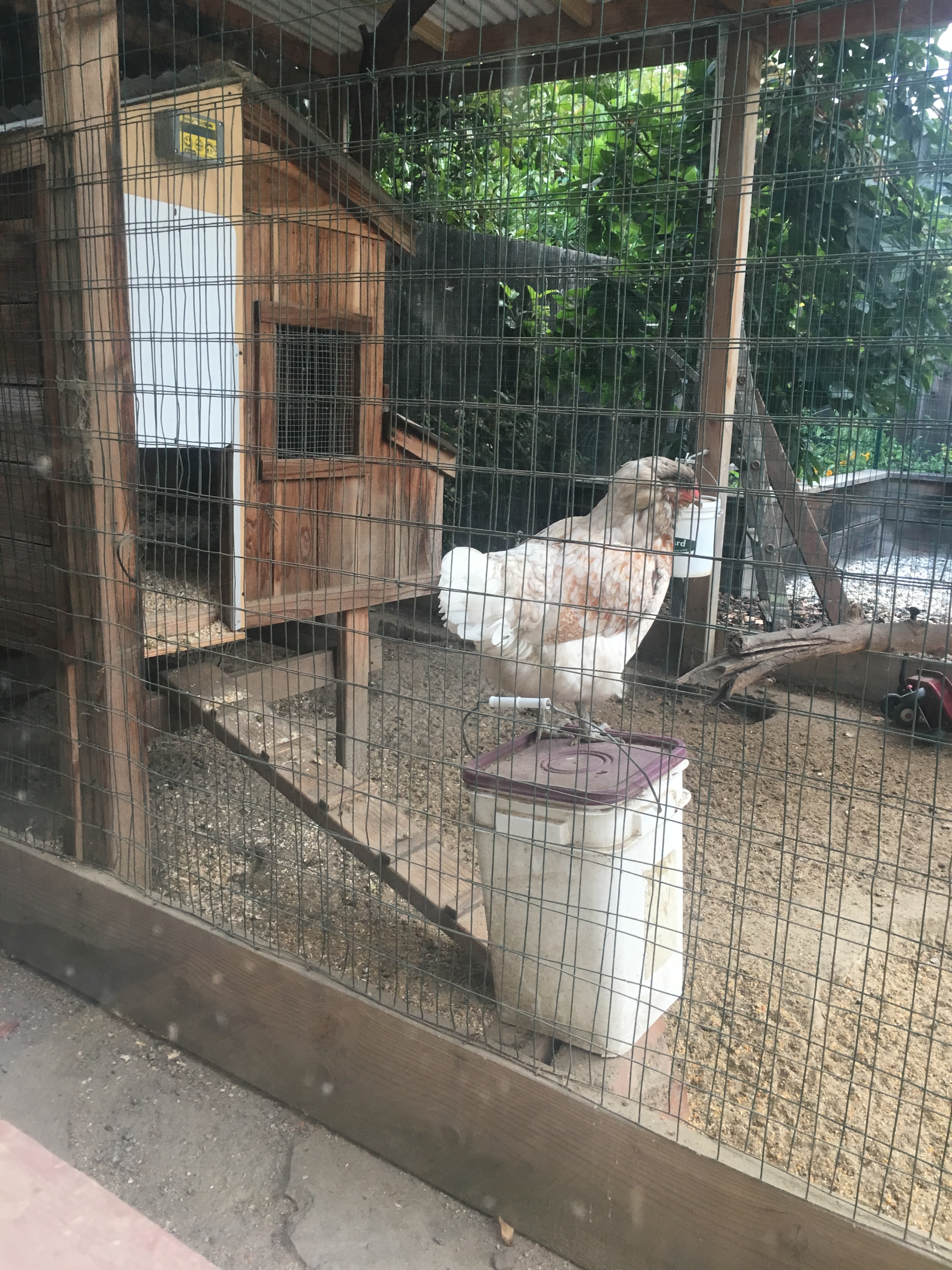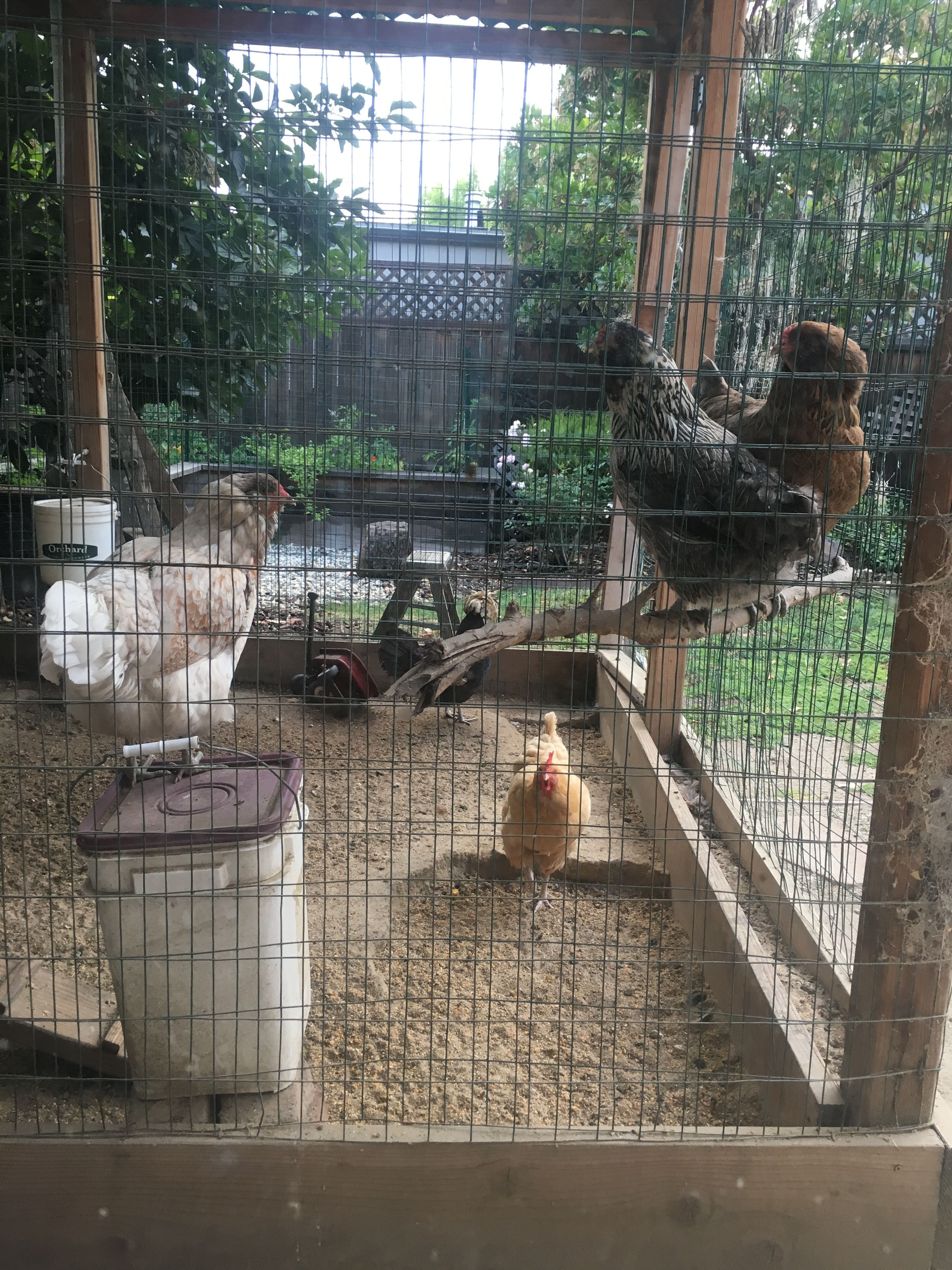 Coop with 5 girls, raised bed garden Our coop is a cute little house with an automatic chicken door, self feeder bucket that reduces waste and water. It’s all set up to allow for easy weekends away or help from neighbors who love to collect the fresh eggs for us when we travel.